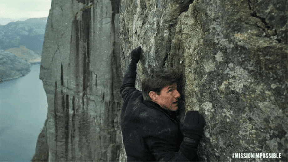 Ethan Hunt (Tom Cruise) is going to be doing a lot of falling in this movie and here's a shot of him losing his grip on a mountainside, which is probably not good.