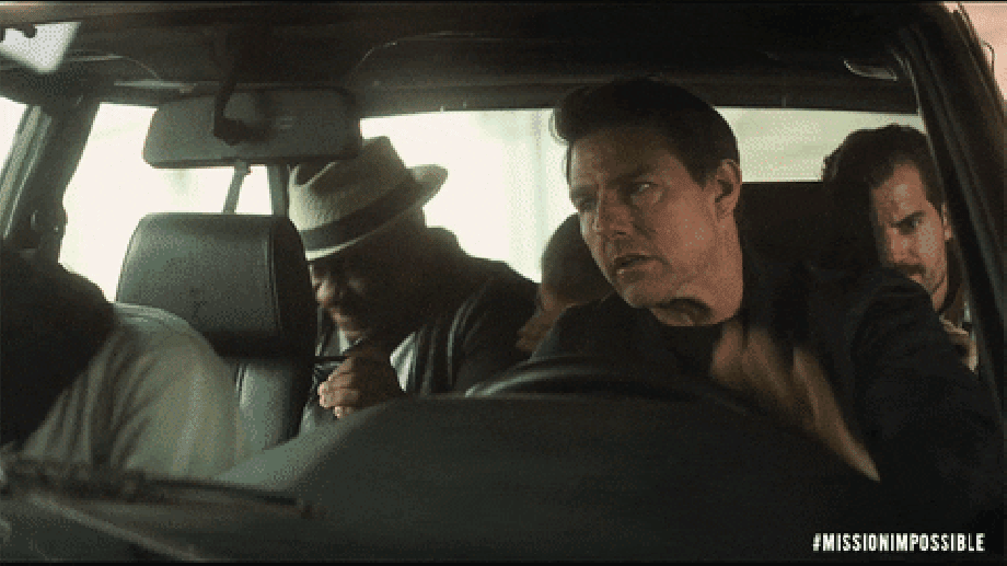Ethan Hunt (Tom Cruise) shows off his mad driving skills with Solomon Lane (Sean Harris) riding shotgun and Luther Stickell (Ving Rhames) and August Walker (Henry Cavill) hanging on tightly in the back.