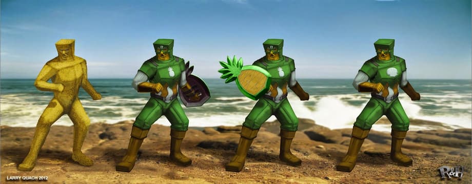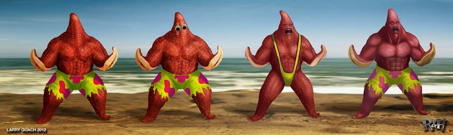 They could've looked a lot different if producers had chosen to go with Larry T. Quach's designs instead. Back in 2012, when he was working for Rhythm and Hues he designed them as The Avengers: SpongeBob SquarePants as Captain America, Patrick Star as The Hulk, Squidward Tentacles as Thor, Mr. Krabs as Iron Man and Plankton as Loki.