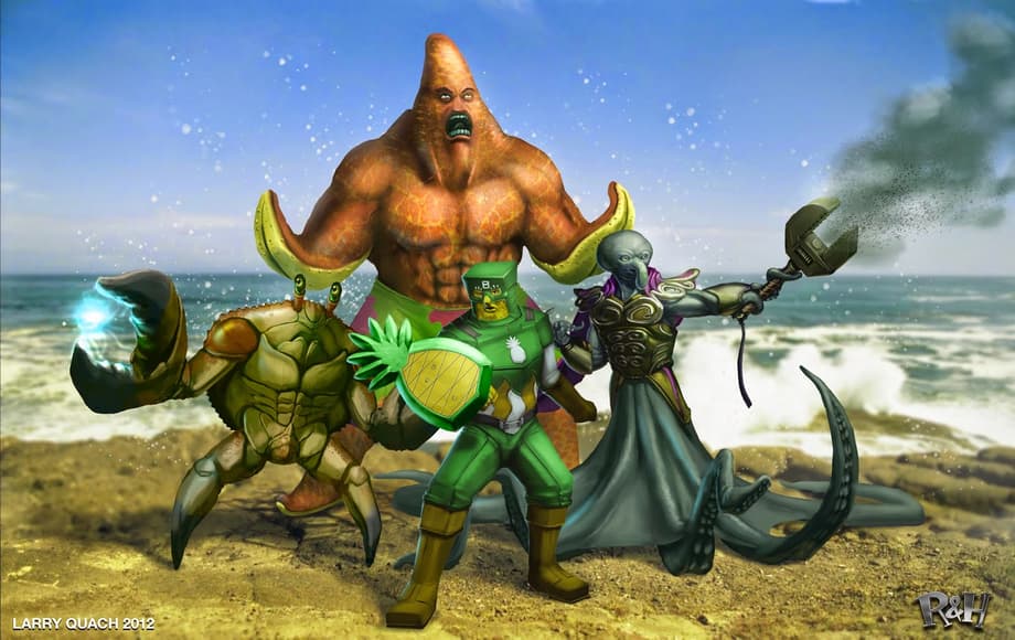 Conceptual artist Larry T. Quach has updated his blog with pitch art he created for The SpongeBob Movie: Sponge Out of Water. In the film the main characters transform into superheroes and Quach illustrated them as The Avengers. It wasn't used.
