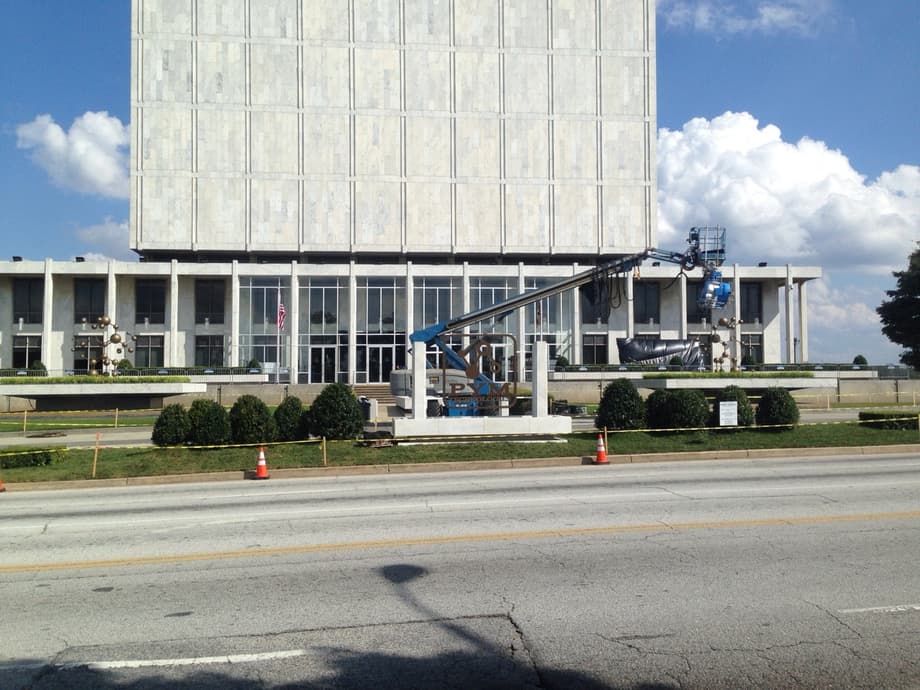 Despite how discreetly Ant-Man has been filming in Atlanta, Georgia, for the past couple of months, the Marvel production caused a bit of an outrage last week due to "destructive" set preparations. According to multiple local news reports, the studio had removed eight decade-old magnolia trees to get a better shot of an abandoned State Archives Building, which a recent Ant-Man set photo (via Tumblr) reveals is doubling for Pym Technologies in the movie. Anyhow, an Atlanta arborist had argued that Marvel removing the trees without a permit is destruction, and that he believes the city's mayor is giving the studio special treatment. However, what the arborist doesn't care to realize is that the State Archives is expected to be demolished soon along with the magolia trees.
