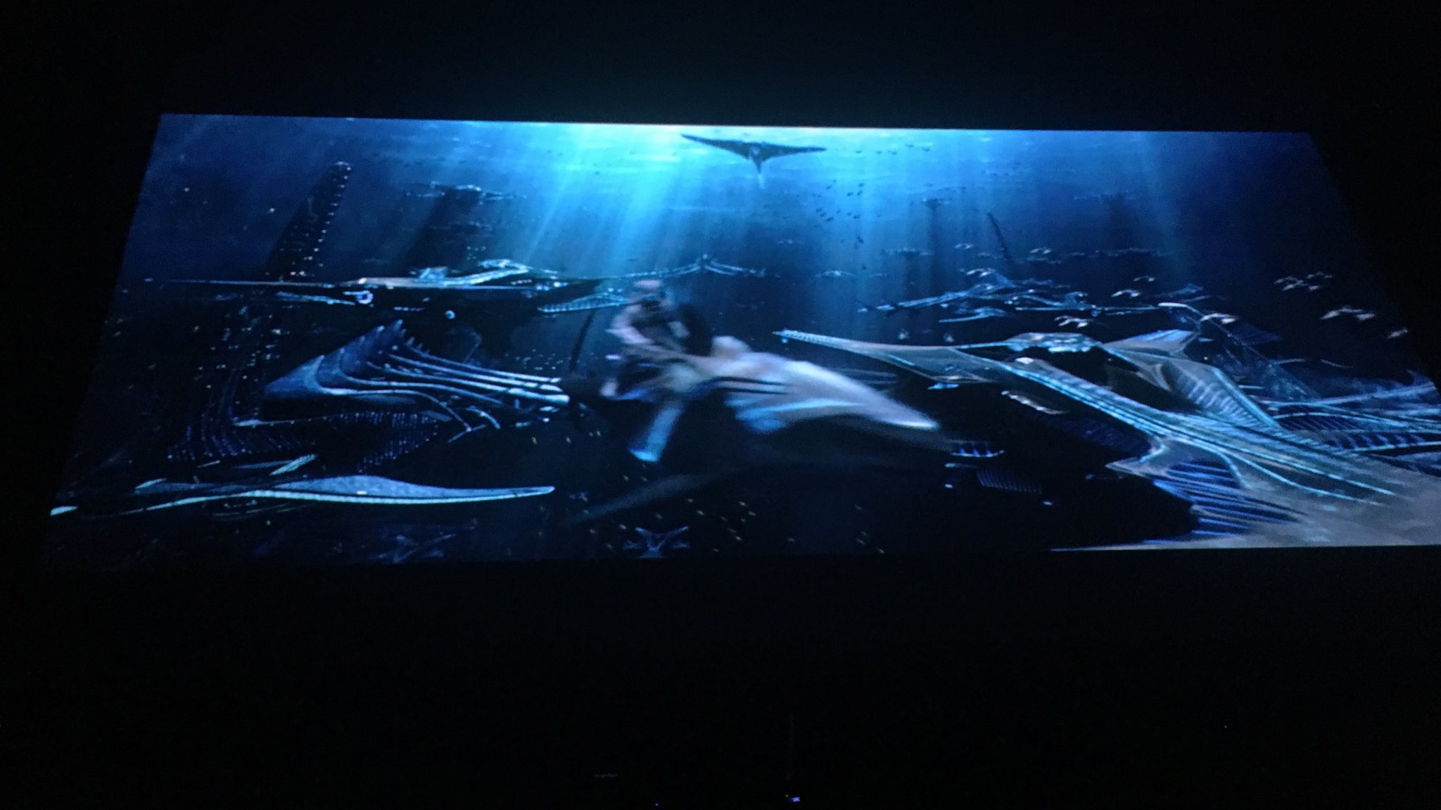 A short sequence from the film was then shown — two older men on a fishing boat then discovering Atlantean ships, followed by a shot of the world of Atlantis. Then, Arthur Curry (Momoa) holding a sword, talking to someone off screen and preparing to fight — then the logo.