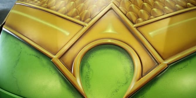 Despite looking a little more worn and not quite so golden bright, the logo on Aquaman's belt looks like it's been torn straight from the pages of the comic books. There have been variations of it over the years, but this one doesn't appear to take any inpiration from one particular comic. At least it's not literally the shape of an "A" anyway. Not including it at all likely would have upset fans.