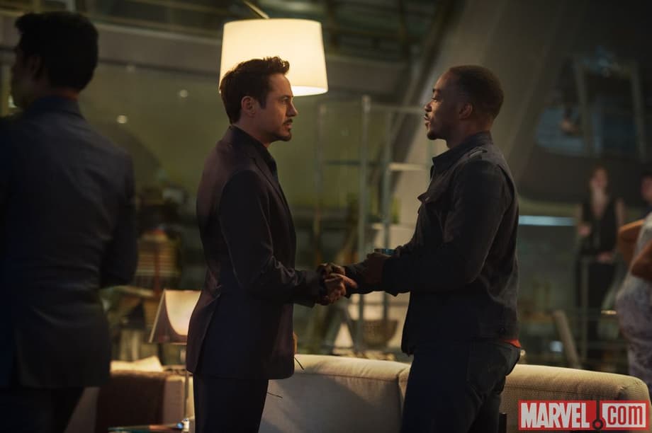 Some of these were previously-seen, but 14 Age of Ultron stills have hit with a first look Sam Wilson and Baron von Strucker, as well as new look at the team and others as they'll appear in the movie.
