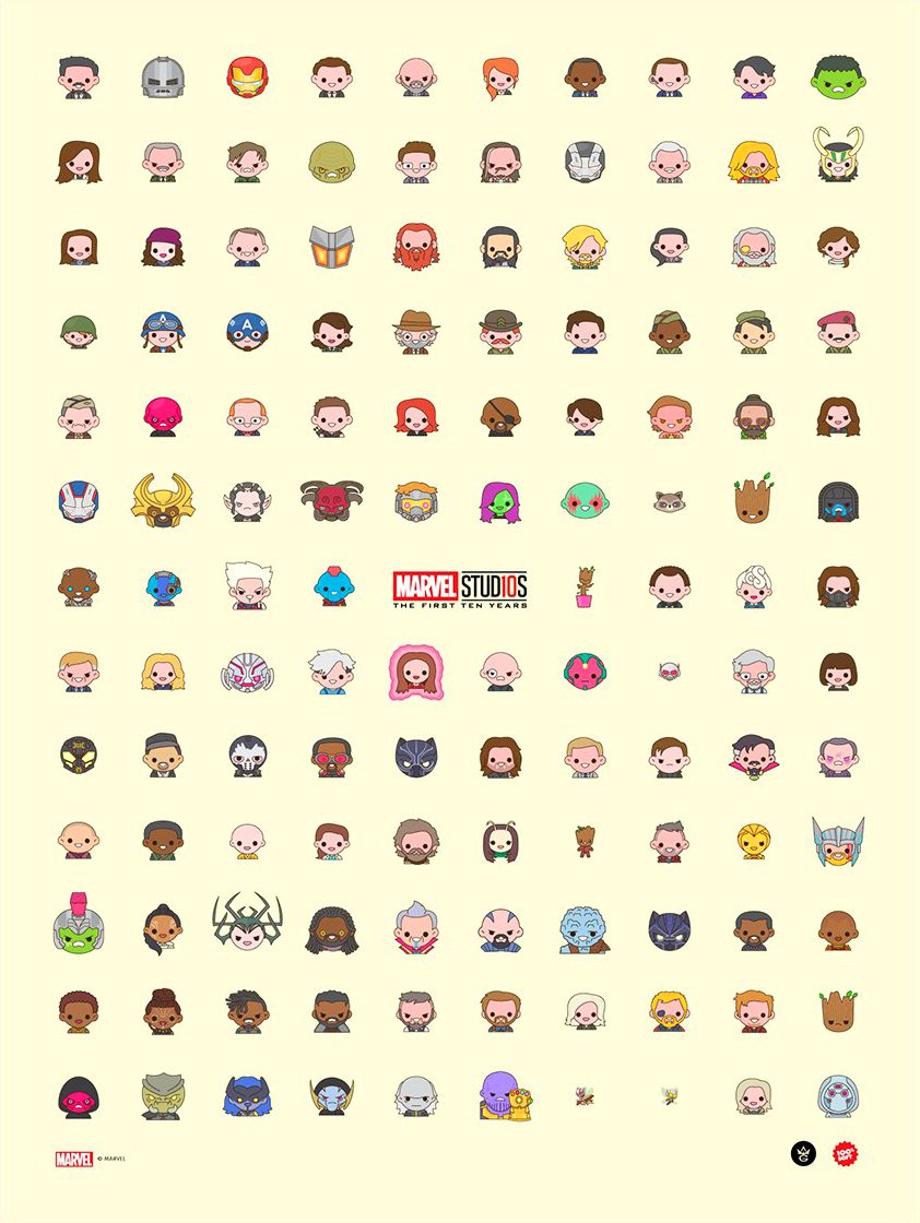 "Officially licensed anniversary print for Marvel Studios, featuring all your favorite MCU characters, designed and drawn by me," says the poster's artist, 100% Soft, on his site. "I've spent the past few years as the official designer of Marvel Studios' official emoji, so this was a fun chance to celebrate Marvel Studios' 10th anniversary and all the fun characters I've gotten to draw for them."