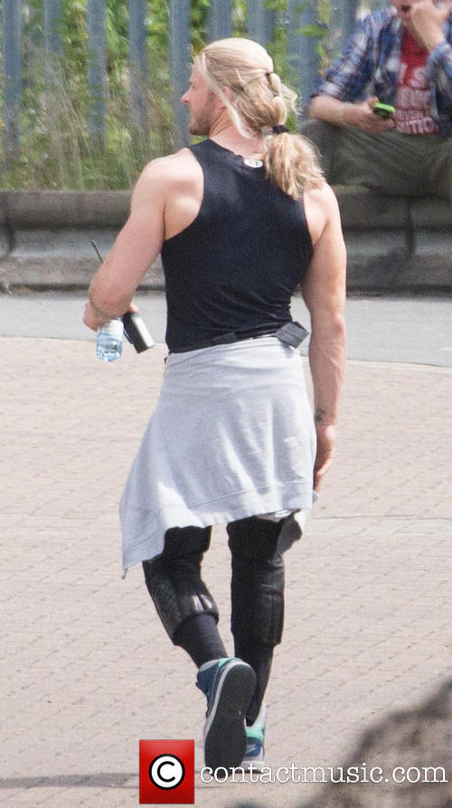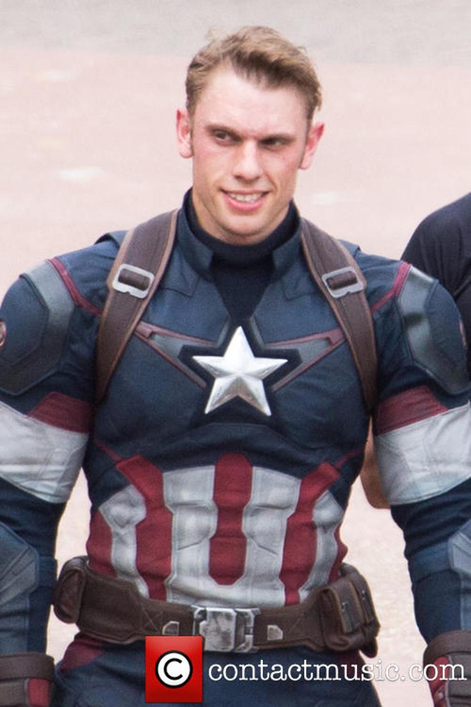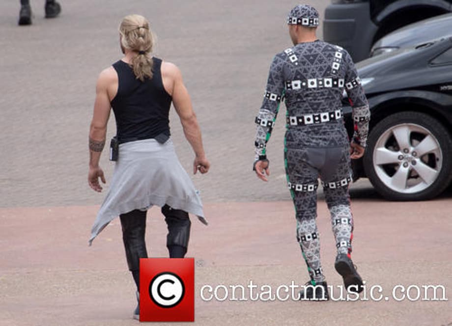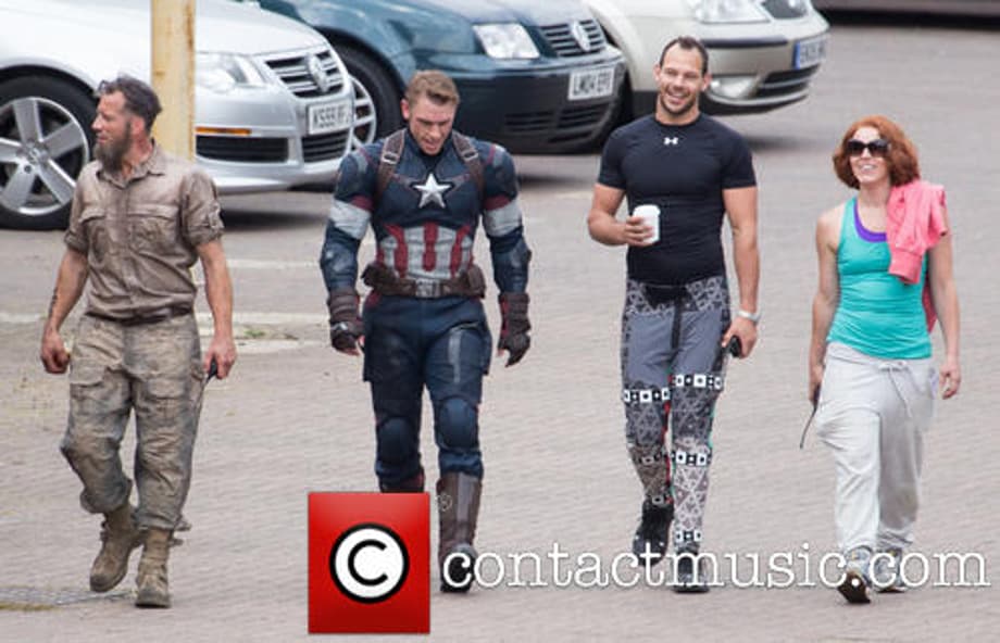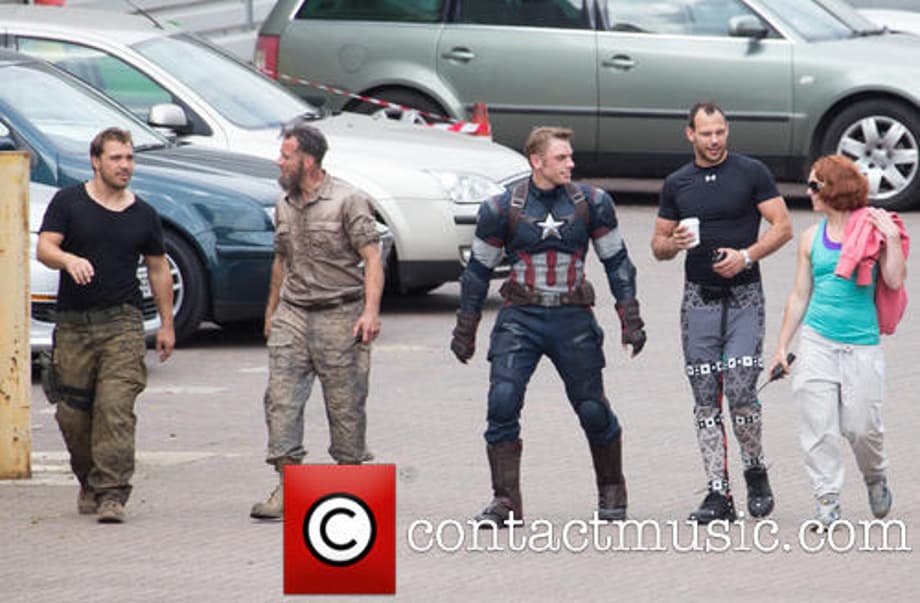 Elizabeth Olsen Returns To AVENGERS: AGE OF ULTRON Set with Cap And Thor Stunt Doubles