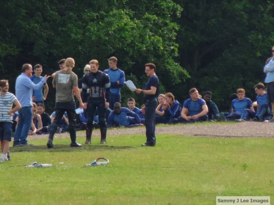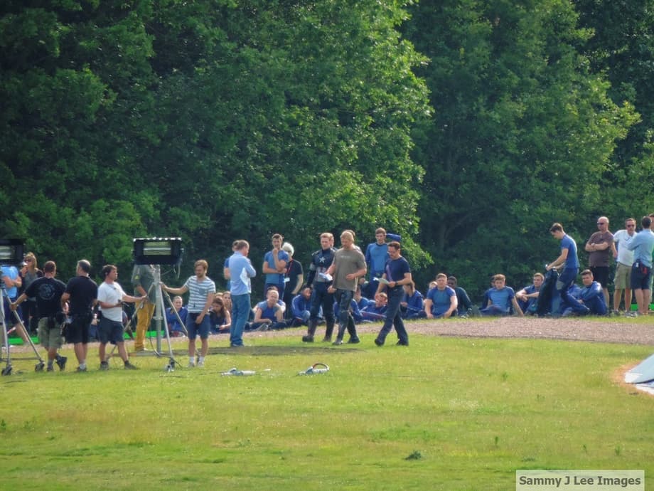 As reported yesterday, filming for Avengers: Age of Ultron took over the University of East Anglia campus in Norwich, United Kingdom, where there were confirmed sightings of Chris Evans in his new Captain America uniform, Chris Hemsworth in his slightly altered Thor gear, and of course Robert Downey Jr. sans his Iron Man suit. While there were several other sightings (minor spoilers) reportedly on the set yesterday, UK photographer Sammy J Lee has shared with CBM new photos of the "big three" as they rehearsed a scene together with writer/director Joss Whedon, and in front of a group of "Avengers recruits" (whose uniforms sort of resemble Quicksilver's as seen in Italy). It's also worth noting that it was assumed yesterday the campus was doubling for Tony Stark's Avengers Tower in Manhattan, NYC, but considering the open space that's being utilized in other recent photos, it's safe say it will appear as another setting in Age of Ultron. What do you think?