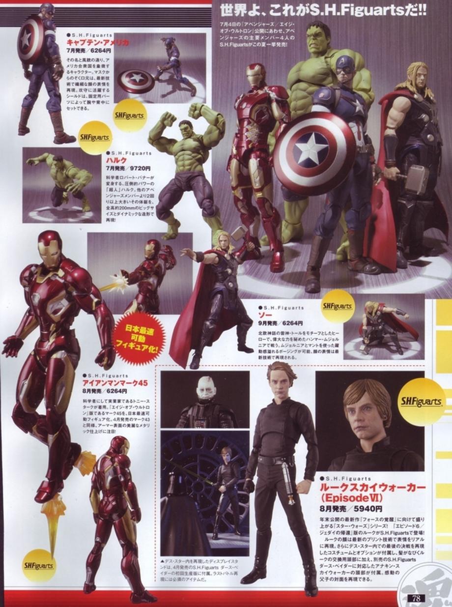 Marvelous News has shared some scans of the S.H. Figuarts Avengers: Age of Ultron movie figures from Tamashii Nations Bandai, and as you can see, they give us a great look at Iron Man's new streamlined armour (presumably Mark 45) whcih he could be seen wearing in the third trailer for the sequel. Visually, it definitely appears as if this could be a stopgap between the suit inspired by the "Extremis" story arc and the Bleeding Edge suit Tony wore during Matt Fraction and Salvador Larroca's lengthy Invincible Iron Man run. Whether Iron Man will be wearing this or a Mark 46 armour in Captain America: Civil War remains to be seen! What do you guys think of this suit?