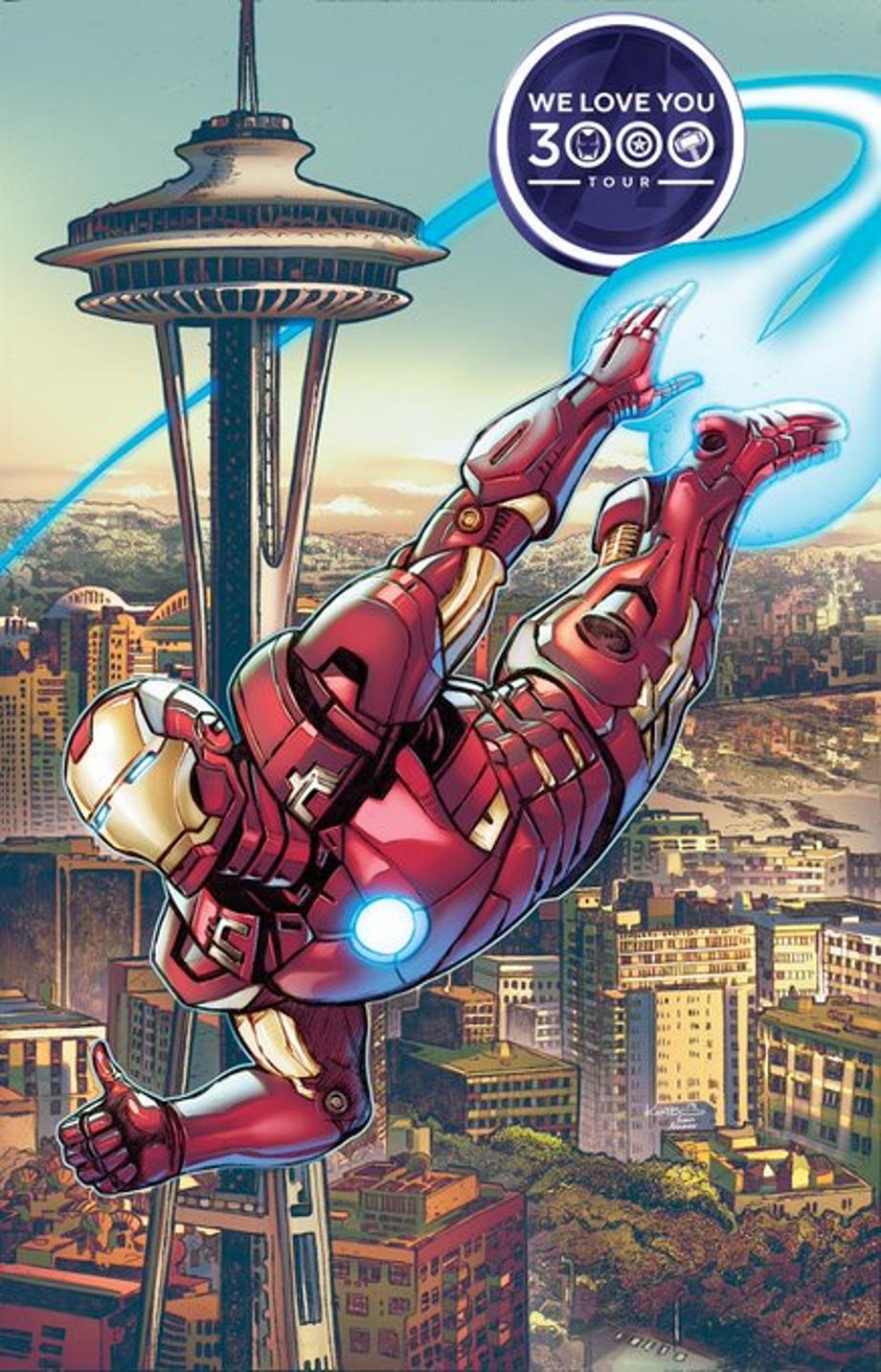 The poster charts the adventures of Tony Stark (Robert Downey Jr.) in the Marvel Cinematic Universe, from his introduction in the first