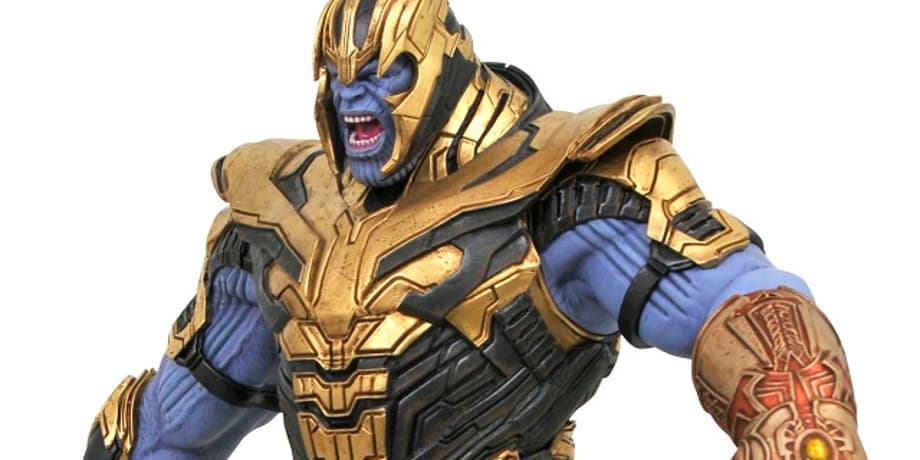 some Diamond Select statues showing the Mad Titan standing atop the team's shattered logo.