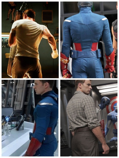 "Chris Evans has never been comfortable with that outfit from the first 'Avengers' movie. And so in the rearview mirror, it’s a little way to wink at how that was then and this is now. And then it sort of just built from there. By the time we got to the fight scene where he defeated himself, his butt is on the ground and was just sitting there for a callback."