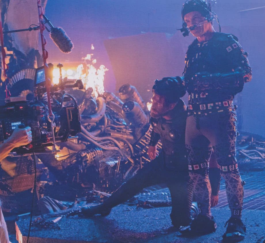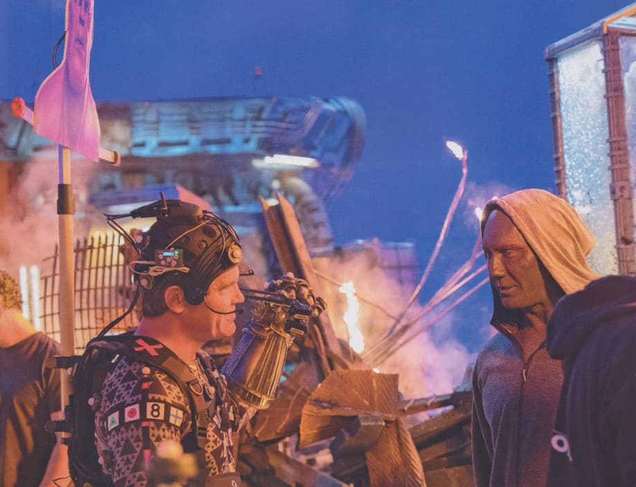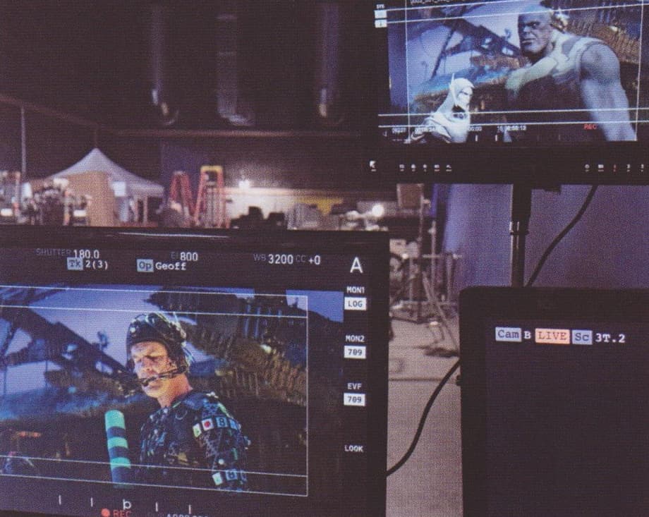 How clever is this? On the one monitor, we have Josh Brolin's mo-cap performance and on the other is a crudely animated version of Thanos which gives the VFX team a good place to start with him.