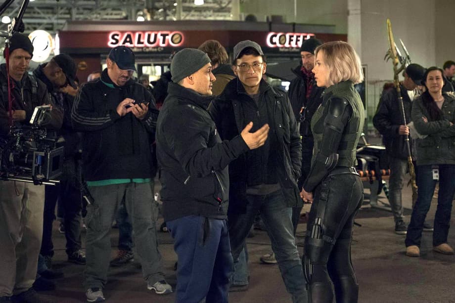 As you can see below, Marvel Studios has released a fresh look at Scarlett Johansson suited up as Black Widow while she discusses the scene with directors Joe and Anthony Russo. That looks an awful lot like Proxima Midnight's spear in the background, so chances are this is actually some sort of battle scene.