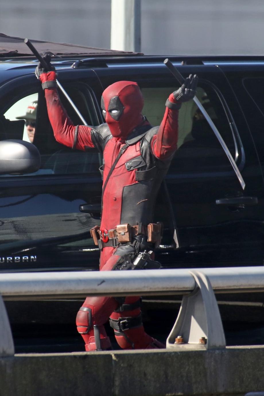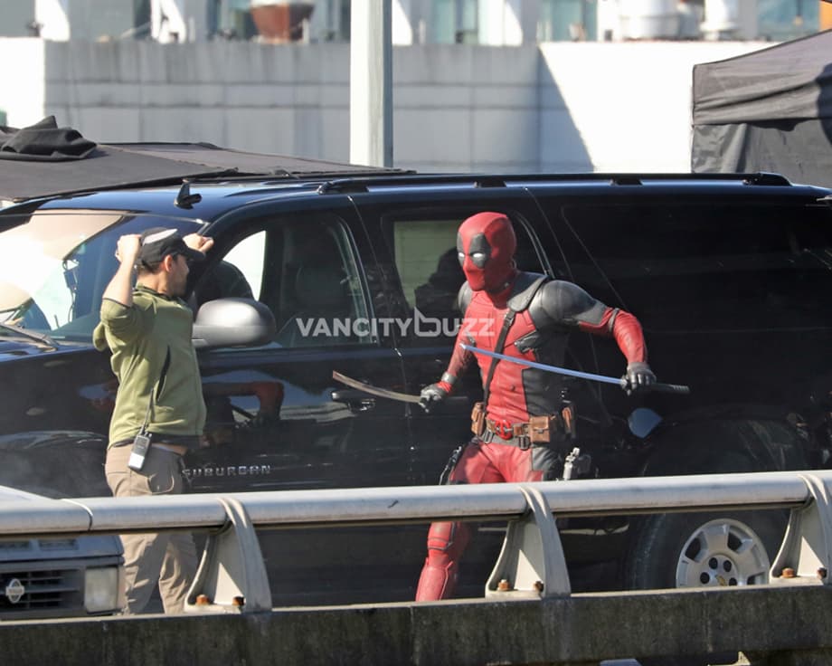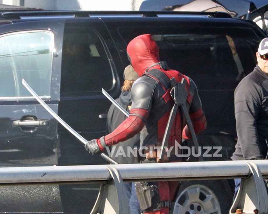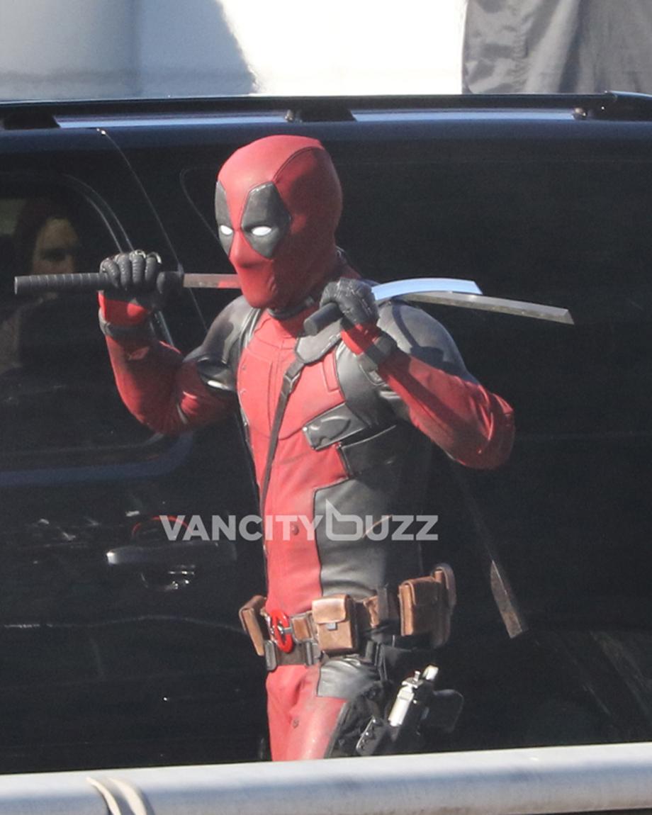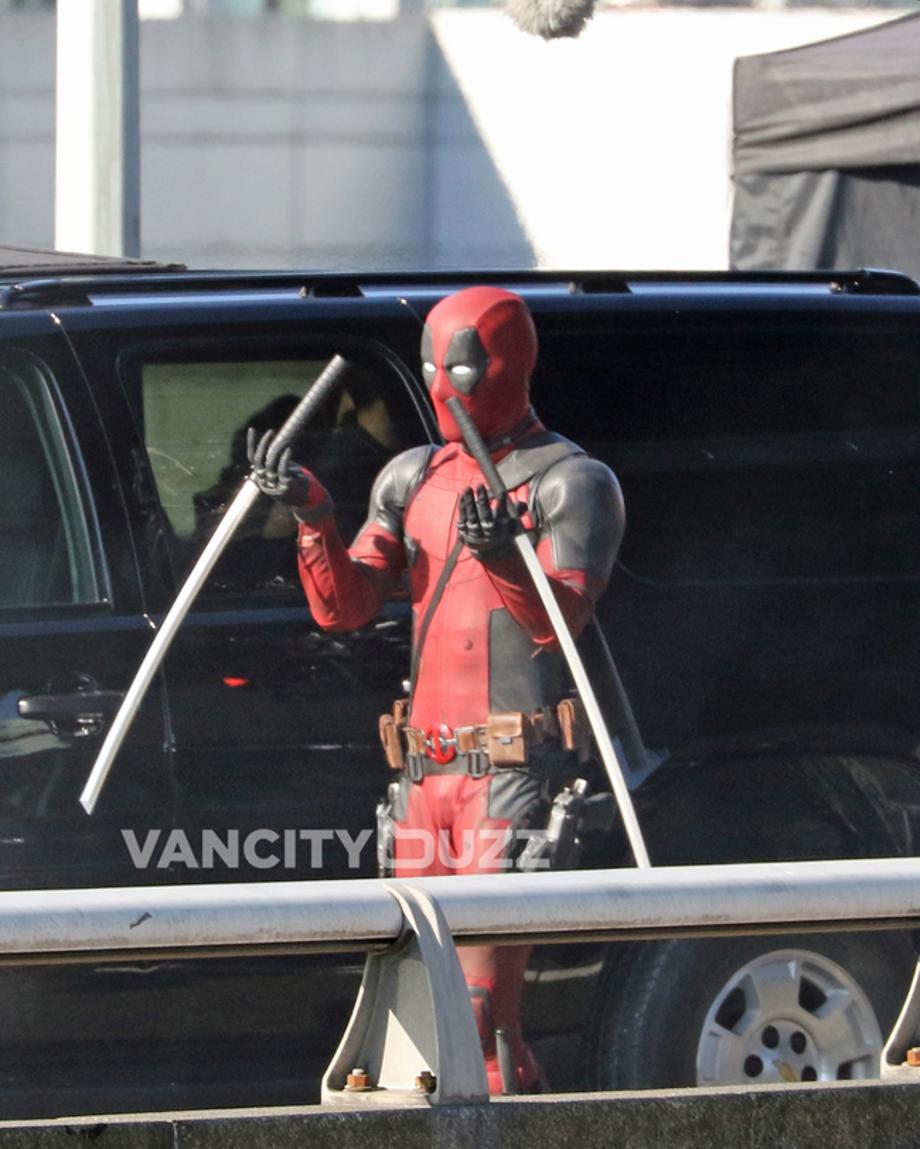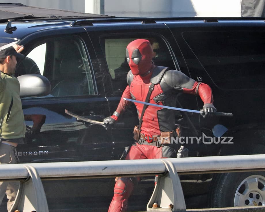 Yesterday was the fourth day of filming for Deadpool on the closed Georgia Viaduct in Vancouver, and you'll never guess who was on set... Ryan Reynolds, in full costume! Okay, so we might have seen the Canadian actor suited up on set almost everyday this week. However, the latest photos from Vancity Buzz show the Merc With A Mouth retiring his guns, and finally using his katana swords which he's named Bea & Arthur (see), according to a recent tweet from Reynolds himself.