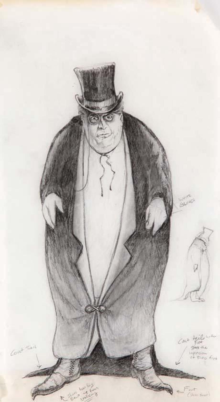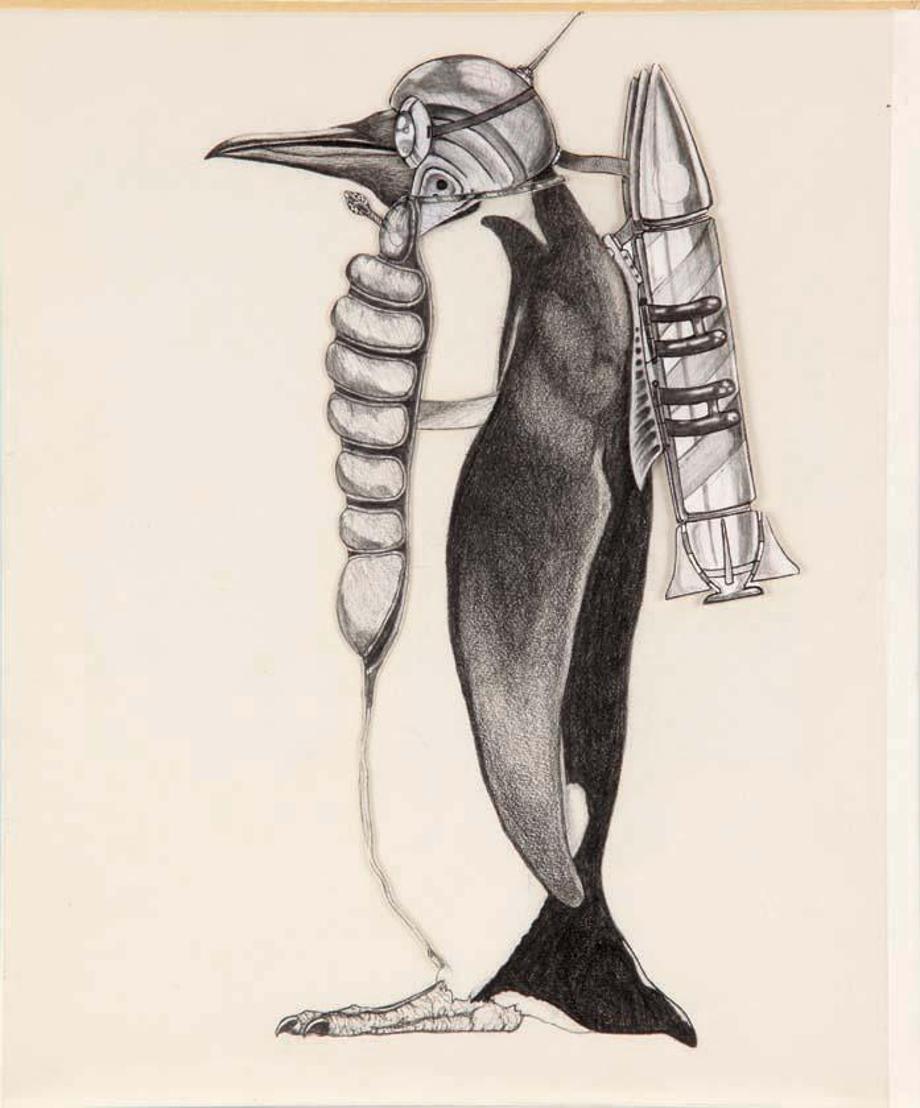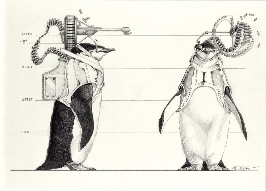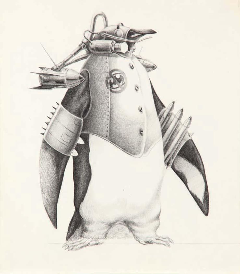 Batman Returns concept art includes facial, body and hands variations of Danny Devito’s character “The Penguin.” The next batch is a series of renderings for Penguin's flock of penguins that were strapped with a mind-control helmet and a harness for their deadly missiles.