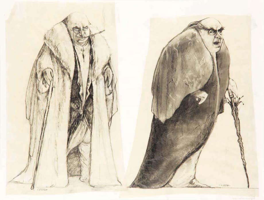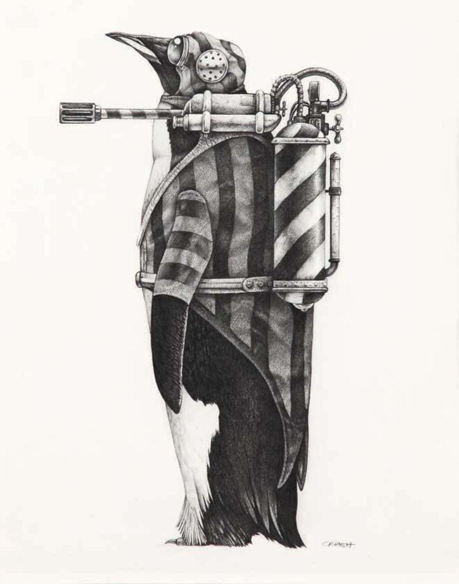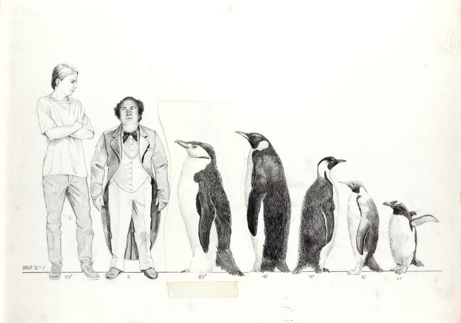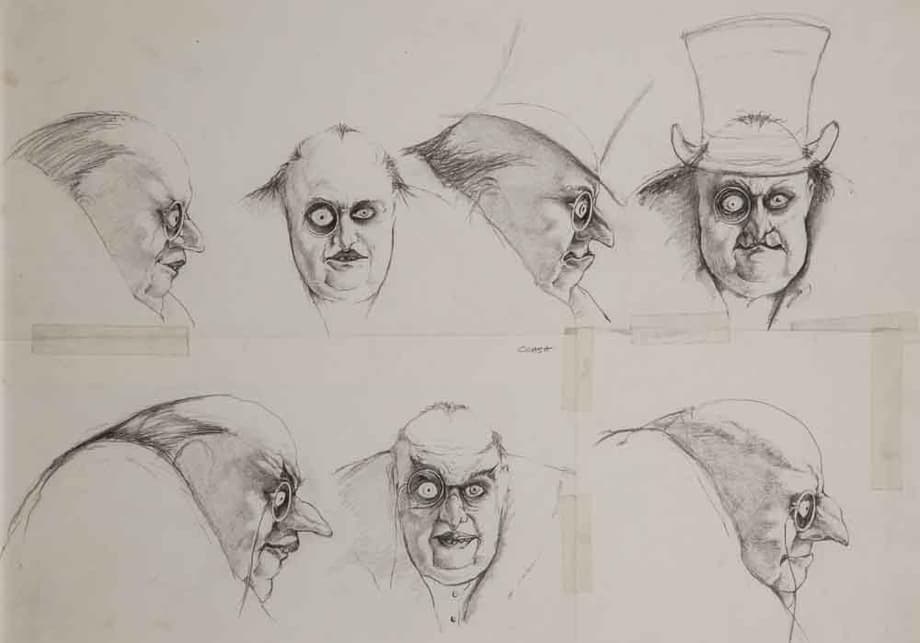 Batman Returns concept art includes facial, body and hands variations of Danny Devito’s character “The Penguin.” The next batch is a series of renderings for Penguin's flock of penguins that were strapped with a mind-control helmet and a harness for their deadly missiles.