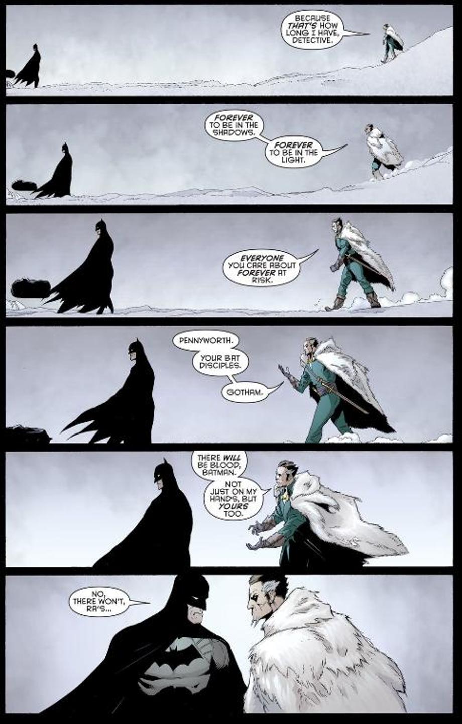 Batman and Ra’s have so much history. And unlike a lot of Batman’s villains, Ra’s and Bruce’s history is a lot more subjective. Batman has been in love with Ra’s' daughter Talia, they’ve conceived a child in some iterations and Batman has often been thought of as Ra’s’ equal. Batman has been active for 20 years. Who knows what history he and The Demon’s Head have? Countless skirmishes, tests, resurrections, sidekick kidnappings etc. I know that there is history between Batman and all his villains but it’s not as complex and intimate as this one. Ra's is a villain who has a mutual respect for Gotham’s Guardian. Most villains don’t respect the hero. He admires and definitely covets Batman’s youth and skill. Ra’s even bestowed Batman with the affable moniker “Detective”. What a jovial thing to do.