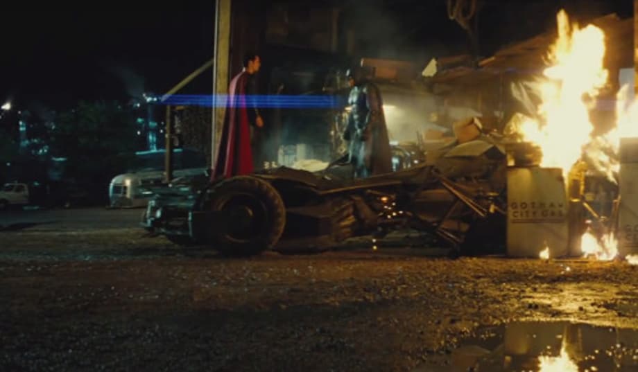 Batmobile's doors wide open. This leads me to believe that encounter number one will end badly for the Bat. Not sure how he walks away, but in all options it will not end well for him. I believe it's after that encounter that Bruce goes to Metropolis to attend the Lex gathering and meets Clark so we can get the clever exchange of words between them.
