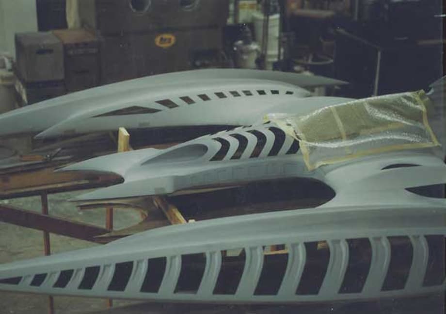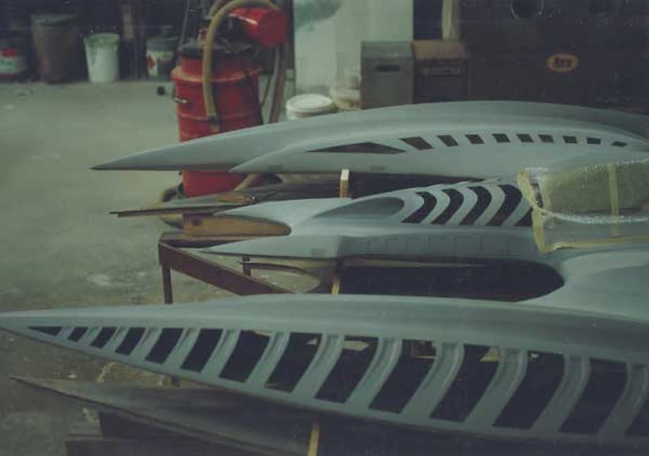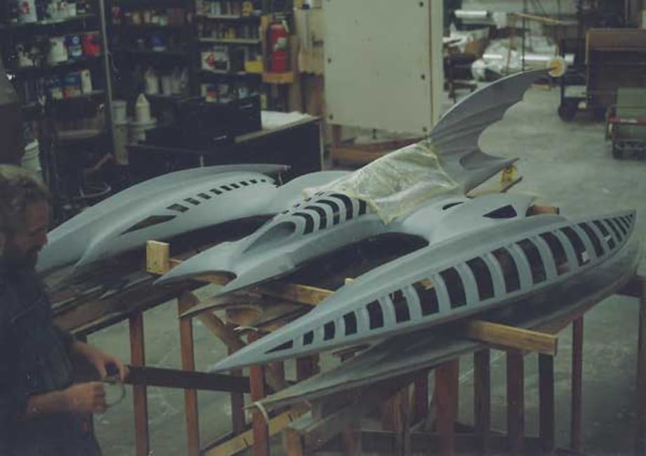 The McCune Design team created a 1/6th scale cave interior, and a highly detailed Bat Plane that hung and launched from the cave ceiling. In addition, extensive labyrinths of tunnels were built for high-speed P.O.V. views from the plane as it exited the Bat Cave. Other scenes required the creation The Arkham Asylum exterior and a highly detailed Gotham Alley. When the alley dead ends, The Bat Mobile raced up a vertical wall. - McCune Design