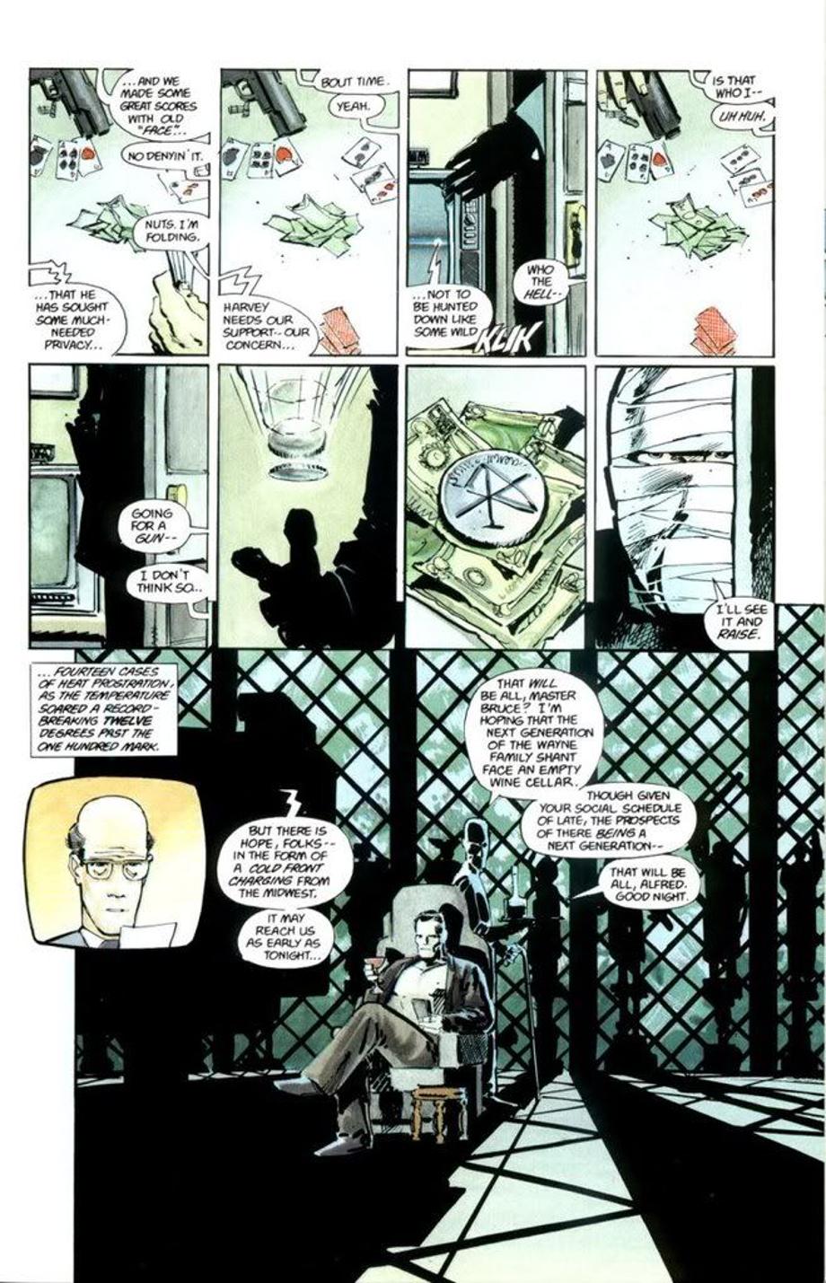 Batman continues to work in secret to find answers, while Harvey Dent recovers in Gotham Hospital. Blaming Batman for everything, Dent enacts martial law in Gotham.