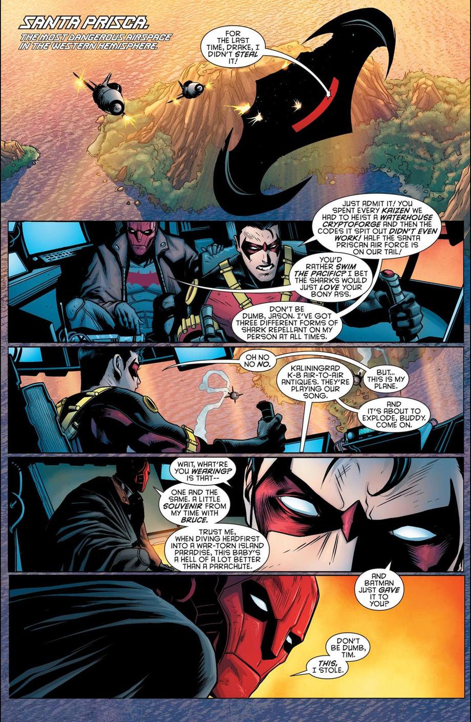The new issue also gives Batman fans a little treat by alluding to the famous scene from the 1966 Batman Television Series. When making fun of their possible demise, Red Hood jokes about sharks eating Red Robin, to which Red Robin replies, "I've got three different forms of shark repellant on my person at all times." Take a look for yourself!