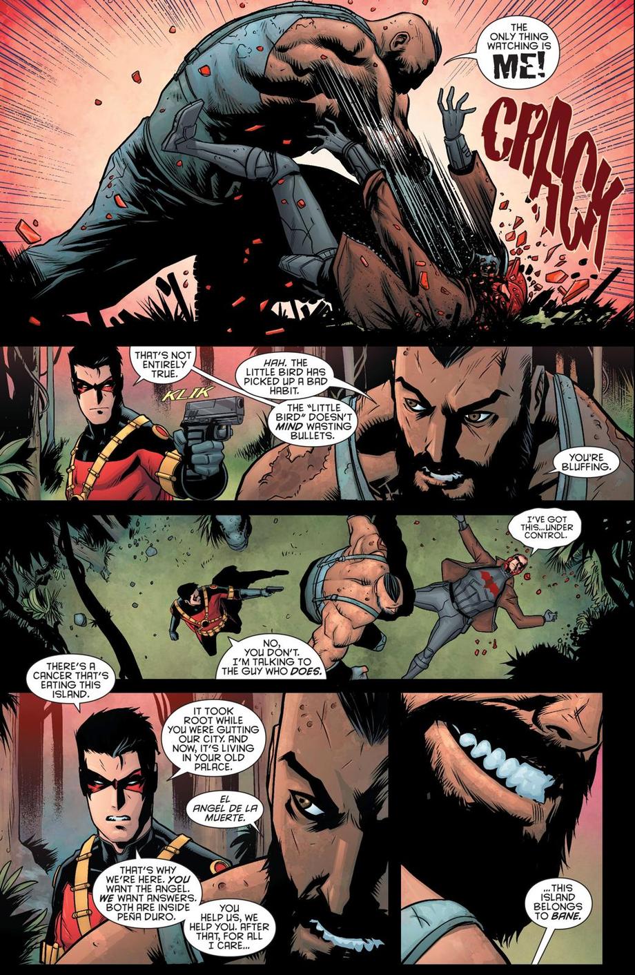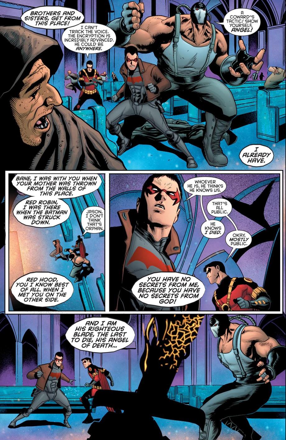 The two heroes run into a venom-less Bane and get into a fight which leads to his unmasking by Red Hood and a serious unprecedented moment between Bane and Red Robin. Bane reveals that he has returned to claim what belongs to him, leading to a team-up. Once they made their way into the Church of St. Dumas, they are greeted by a well-known DC comics character, Azrael. This would be Azrael's official full appearance in DC Comics New 52. What do you think?