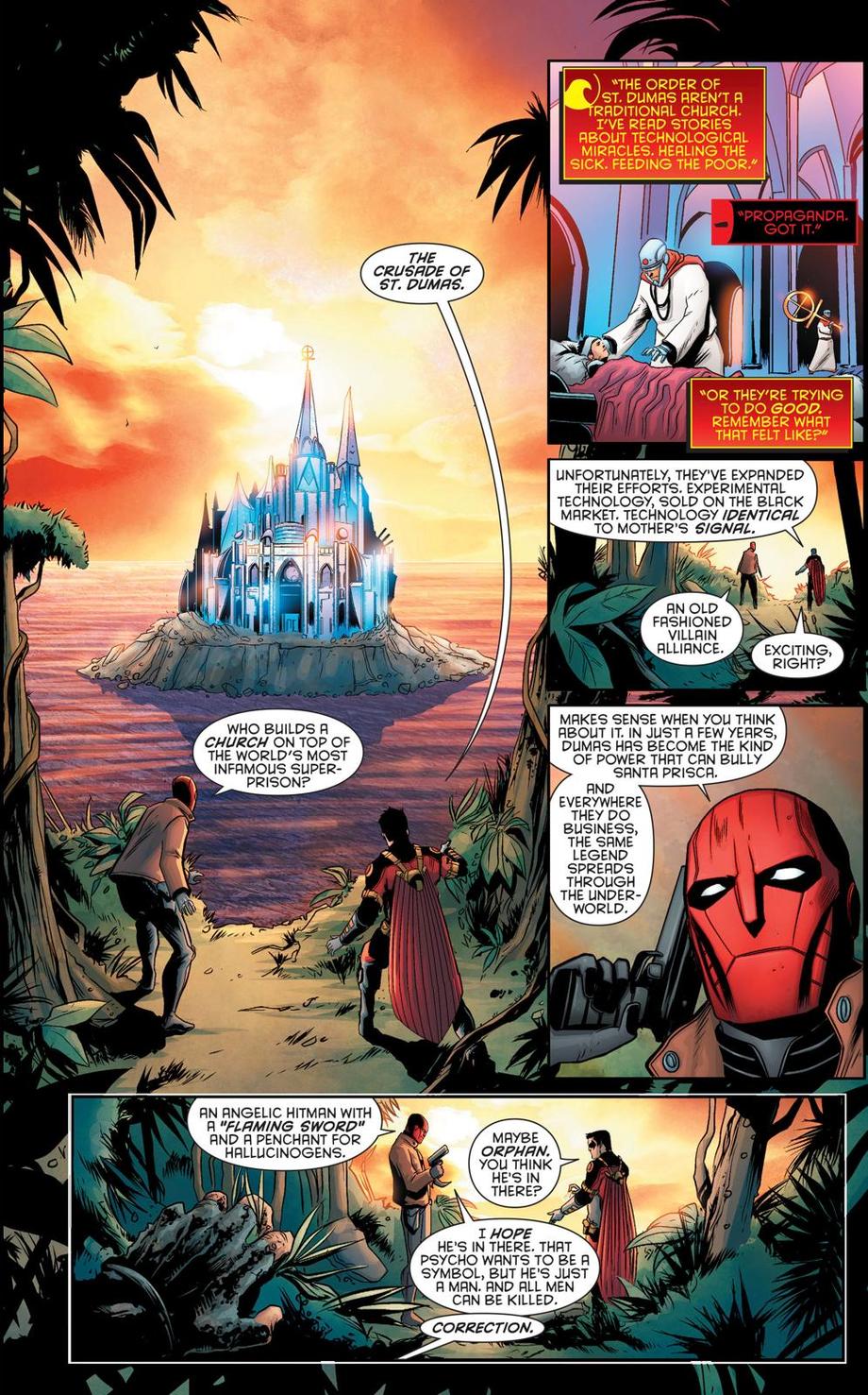 In the latest issue for BATMAN AND ROBIN ETERNAL, the weekly comic book series from DC Comics, Red Robin and Red Hood's investigation into the newest threat, "Mother" leads them to the prison island of Santa Prisca. Once there, they discover that the island has been taken over by none other than The Crusade of St. Dumas, which also appears to be working alongside Mother.