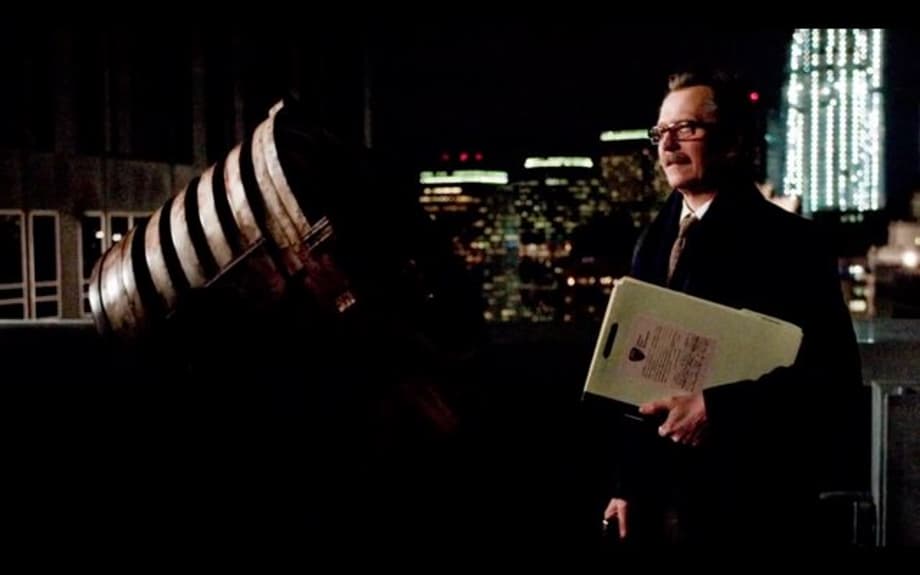 Oscar-nominated actor Gary Oldman was a guest on Jimmy Kimmel's talk show this evening and he brought along a dialogue scene. The clip features a older and worn down Commissioner Gordon chatting with young idealistic police officer John Blake, played by Joseph Gordon-Levitt.