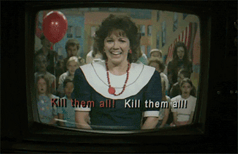 "Sophie screams and jumps to her feet horrified! Waking up GiGi who starts to cry when she sees what's on television--ANGLE ON TELEVISION, Joker gets up and walks right up to the camera. Blood sprayed over his white painted face. Hear the studio audience still screaming, bedlam all around him."