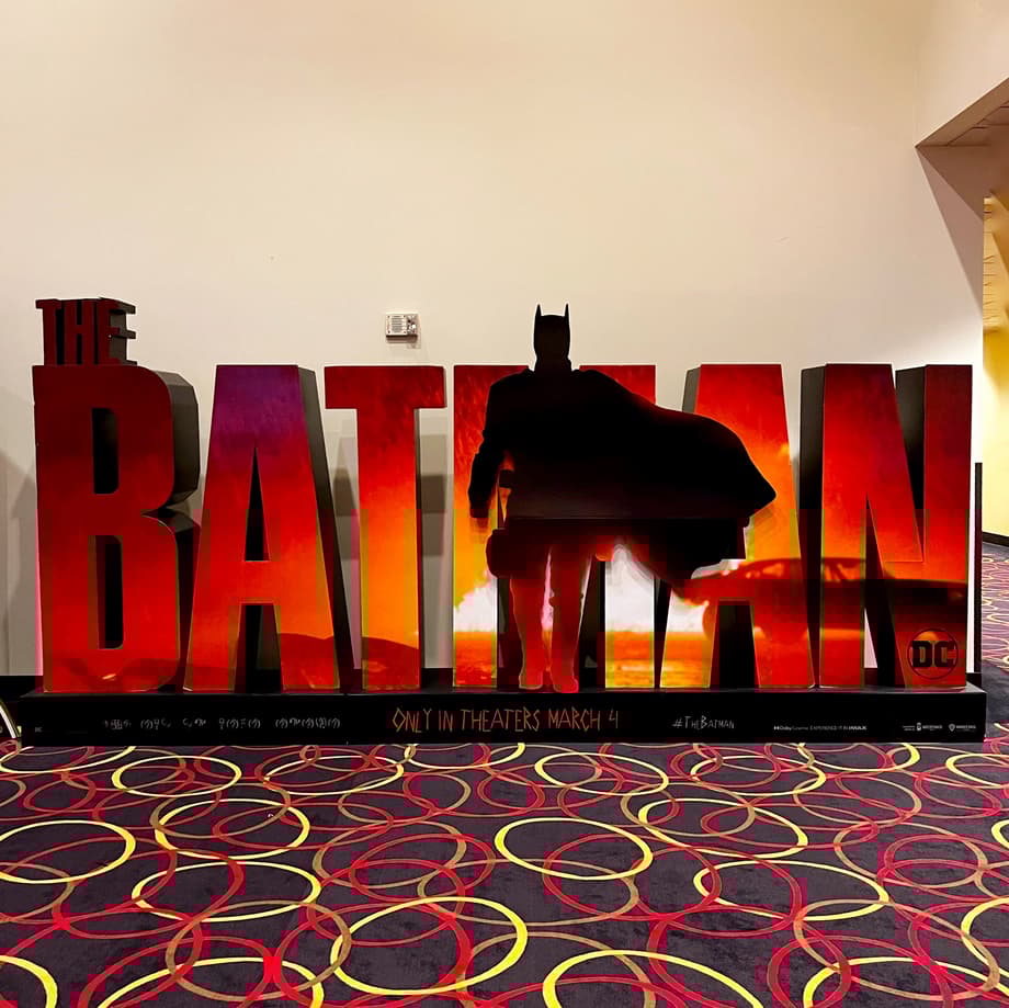 Marketing for The Batman has kicked up a gear as 2021 winds down, and promotional material for the movie is now being spotted in theaters. Most of the posters have already been officially released, but we do have a first look at an awesome cinema standee inspired by the final shot of the recent DC FanDome trailer.