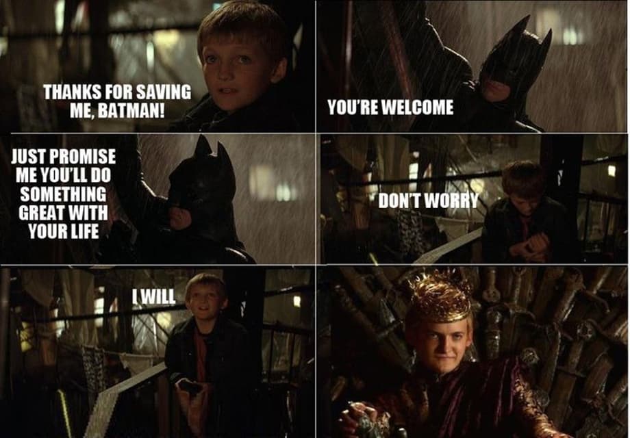 Now for casting. Christian Bale was considered to play Batman in both Arronofsky's Year One and Batman Vs. Superman before landing the part here after doing his audition in Val Kilmer's Batsuit. Because Kilmer can't fit in it anymore. Before Bale got the part, Heath Ledger, Ashton Kutcher, Steven Pasquale, and Keanu Reeves were considered. Laurence Fishburne was considered for Lucius Fox, but Morgan Freeman was cast. Christopher Eccleston, Ewan McGregor, Jeremy Davies, and even Marilyn Manson were considered for the Scarecrow, but Cillian Murphy got the part. Claire Danes, Reese Witherspoon, Sarah Michelle Gellar, and Rachel McAdams were considered for Rachel Dawes, despite the role being written specifically for Katie Homles. Kurt Russell, Chris Cooper, and Dennis Quaid were considered for Gordon, but Gary Oldman got the part, with people deeming him as "the perfect choice". And, since people will kill me if I don't bring it up, young Joffrey is in the movie.