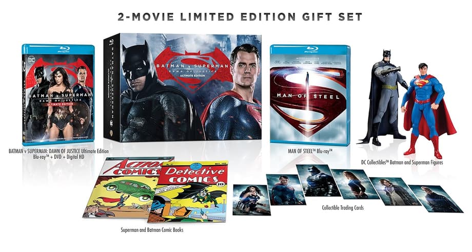 The set will contain Blu-ray & Ultraviolet copies of both Batman v Superman: Dawn of Justice - Ultimate Edition & 2013's Man of Steel, two collectible figurines, two original comic books, and six exclusive trading cards featuring the top-billed cast of the Zack Snyder-directed feature.