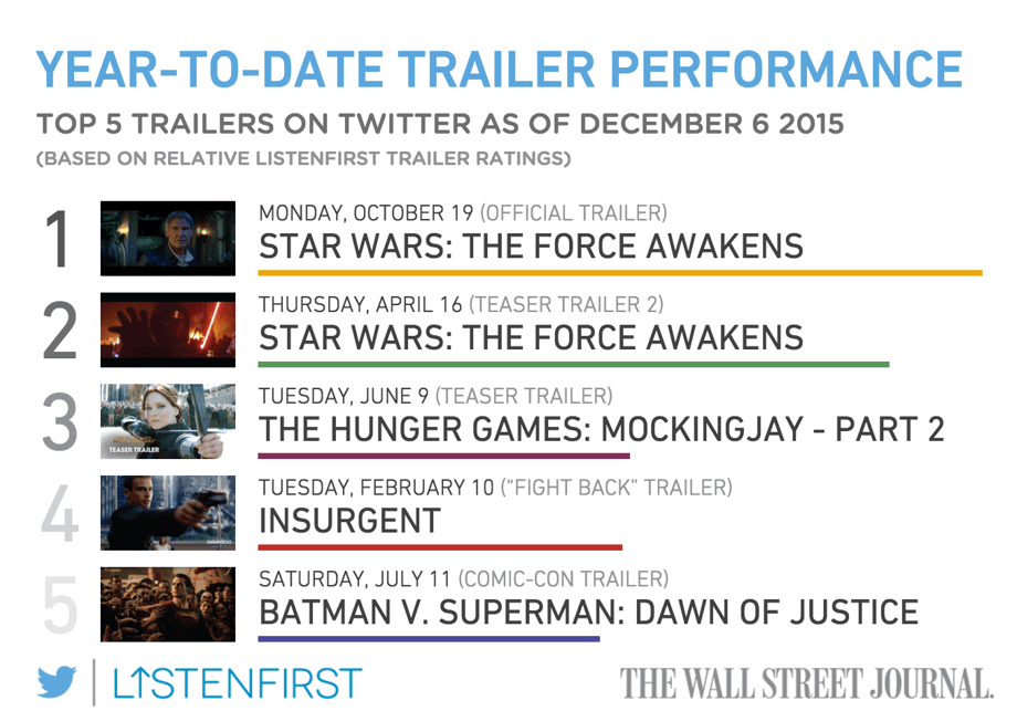 The trailer, however took fifth place behind both trailers for Star Wars: The Force Awakens, the trailer for The Hunger Games: Mocking Jay - Part 2, and Insurgent. There is no surprise there that Star Wars would take the top spot, but the second place spot as well? That is impressive.
