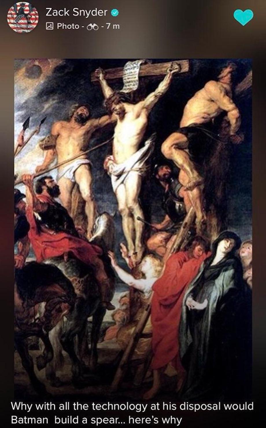 In the post (seen below), Snyder shared a painting of Jesus on the cross, his side being pierced by the spear of Longinus, a Roman soldier. The image is captioned with, "Why with all of the technology at his disposal would Batman build a spear? Here's why."