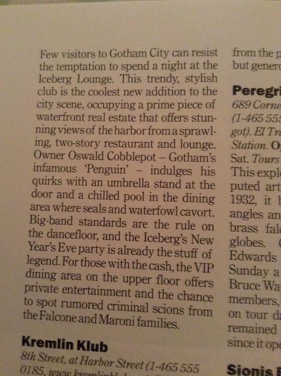 Batman v Superman: Dawn of Justice is just a few short weeks away and what better way to pass the time than to read all about the infamous Gotham City. New images and pages of a tie-in Gotham City Tourist Guide by Time Out have found their way online featuring incredible information regarding the DCEU. The pages feature some pretty big names from the Flying Graysons to Oswald Cobblepot and his Iceberg Lounge. See what more you can find and let us know what you think in the comments section!