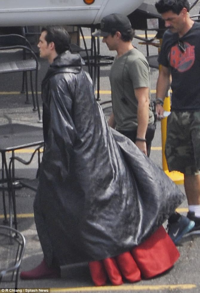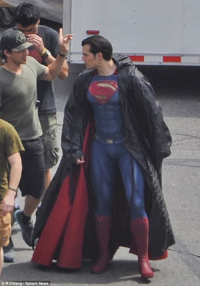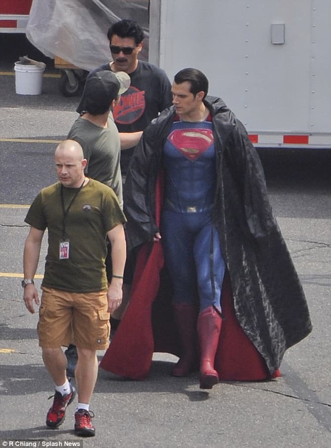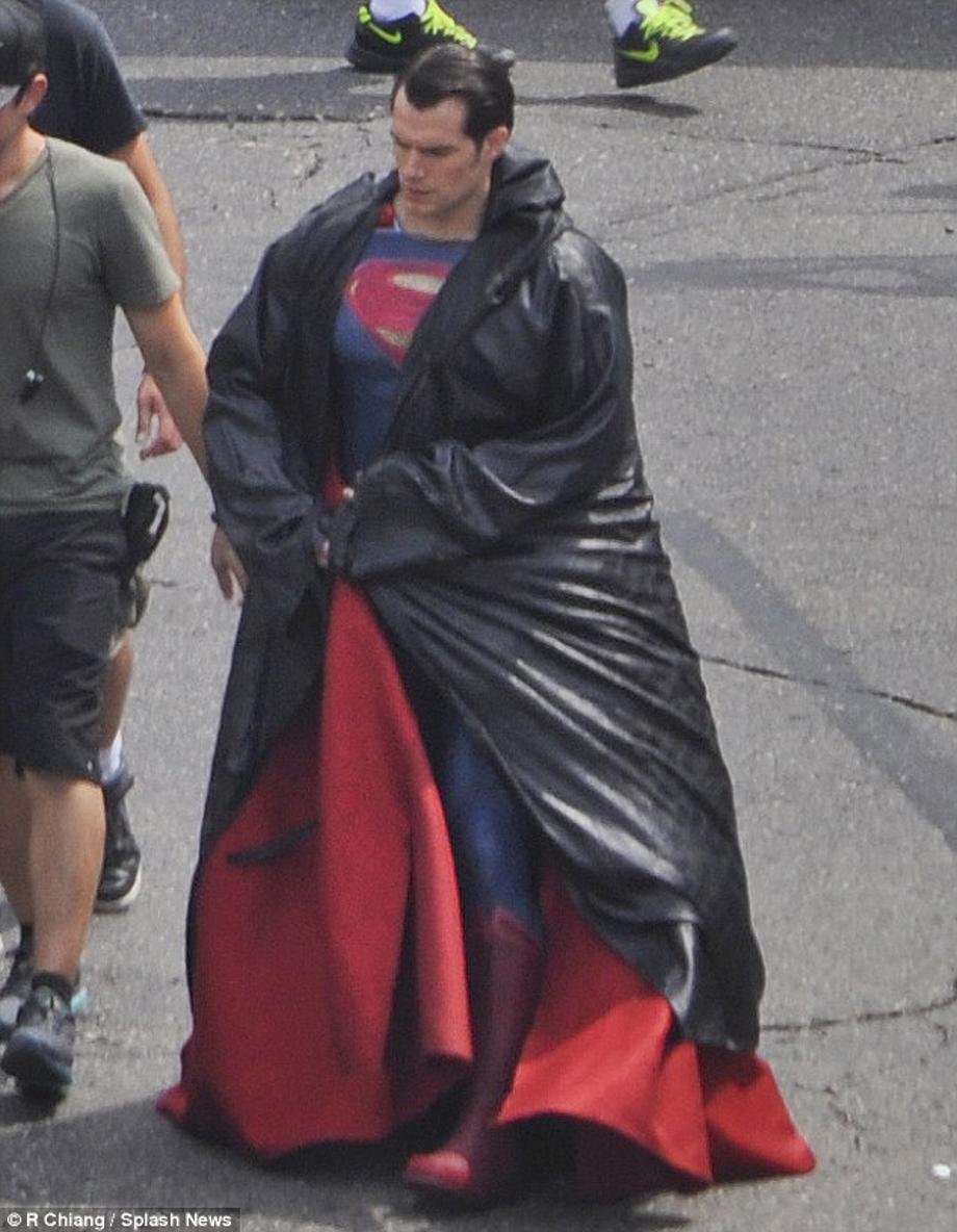 Filming for Batman v Superman: Dawn of Justice is in full swing, and MTV News has brought the latest photo from the Detroit, Michigan, set. While we've officially seen Henry Cavill in his new Superman suit already, the Man of Steel star was spotted on set earlier this week hiding the Kryptonian getup with a black cloak. Today, however, Cavill was heading back to his trailer when he uncovered the goods long enough for papz to get a good shot, as seen in the photo below!