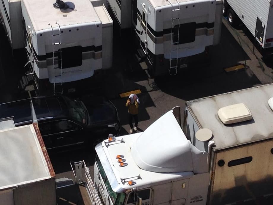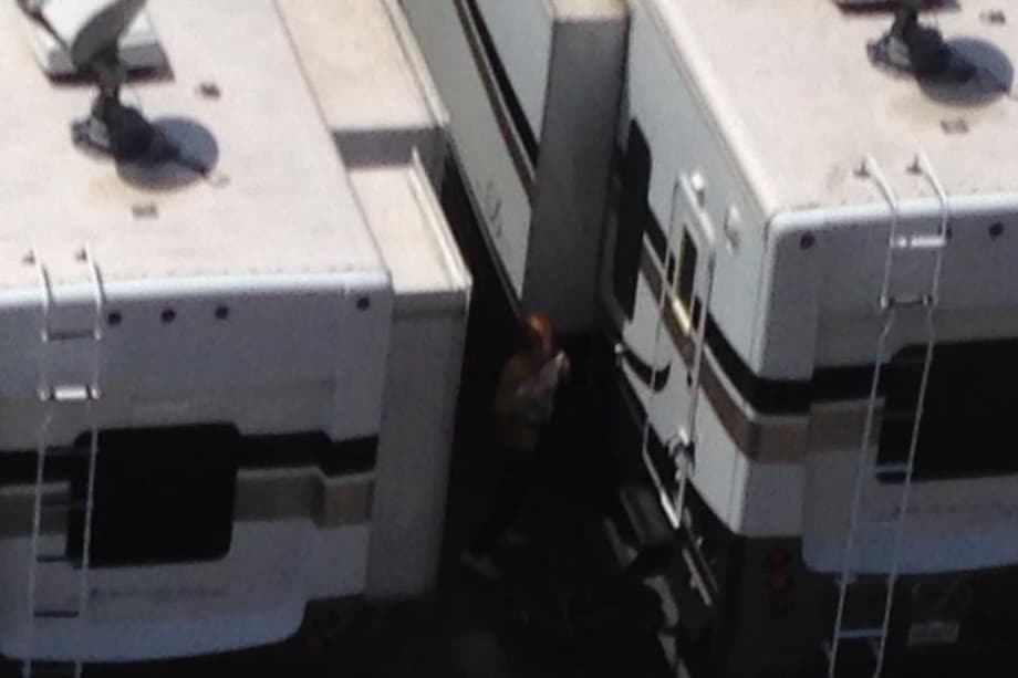 In the first photo the person seems to be hiding between trailers so no photos are taken of him/her. From the Next photo that was taken, it seems like they were waiting for a ride.
