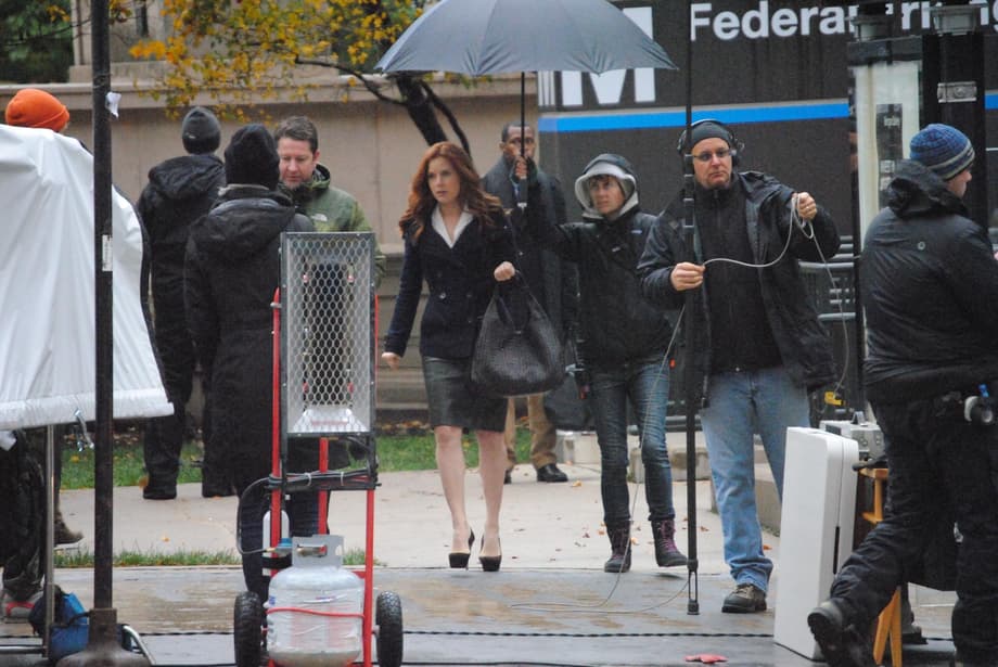 Nothing terribly exciting from today's Batman V Superman: Dawn Of Justice shoot in down-town Chicago (essentially just Lois heading into work by the looks of it!) but we do get our clearest look yet at the returning Amy Adams as Lois Lane, as well as the snazzy new Daily Planet logo and lettering. Plus, though we don't have any pics yet, it's been confirmed that Henry Cavill is also on set so hopefully we'll be able to update with more images later. Apparently all the scene entails is Lois getting out of a cab, pausing briefly to speak on the phone, before heading into the building...only to be immediately kidnapped by Doomsday! Okay, maybe not that last part.