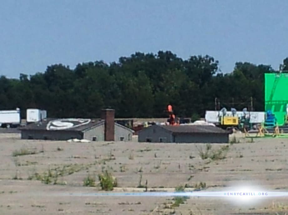 One of the buildings has the “S” shield spray-painted on it. It may be part of the rumoured scene where graffiti is cleaned off the giant Superman statue. You can see that there is a cream-colored building behind the green screen. Our source tells us the giant green screen actually resembles a football stadium with bleacher seats! - henrycavill.org