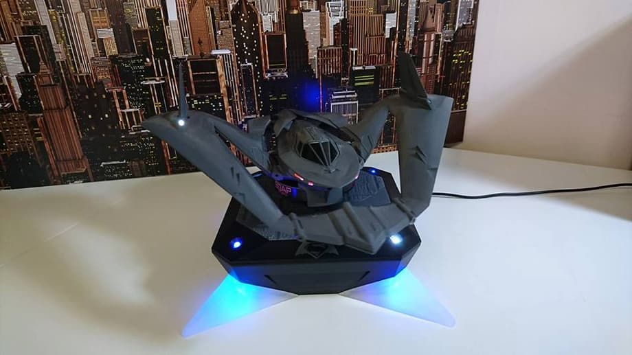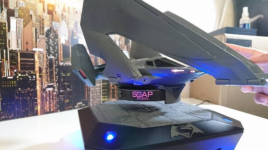 With one teaser trailer and two full trailers for Batman v Superman: Dawn of Justice, we have seen Batman with his Batmobile, in his battle armor, and even with what looks like a gun. So far we have only seen snippets of the Caped Crusader's Batjet in the trailers and through some leaked concept art. Today, some images of a remote control Batjet collectible created by Soap Studio, a company that creates high tech collective toys, have found their way online. The images showcase the remote control Batjet floating on its stand, which most likely also doubles as a charging station, also giving us a better look at Batman's high flying ride. What do you think about this remote control collectible of the Batjet?