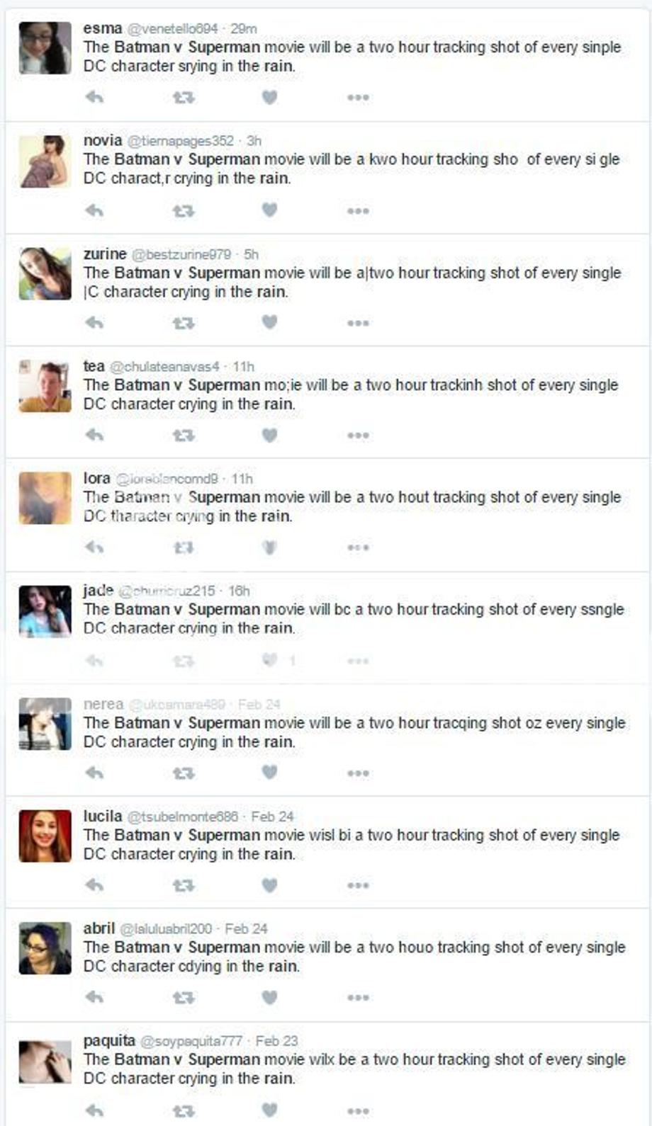 LegendsVII claimed this is happening to Batman v Superman. He posted some interesting findings on the techniques used on Batman v Superman Dawn of Justice. Of all those twitter accounts that are spreading rumors and negativity around Batman v Superman Dawn of Justice, you'll see that they've been active a relatively long time and they've been tweeting random stuff off the Internet through a script that crawls for random text and garbles the text. Could this be the work of someone who hates WB/DC movies and wants desperately for it to fail or could it be Disney themselves? No one’s knows for sure, but if you want to read more about his finding read his post at reddit.