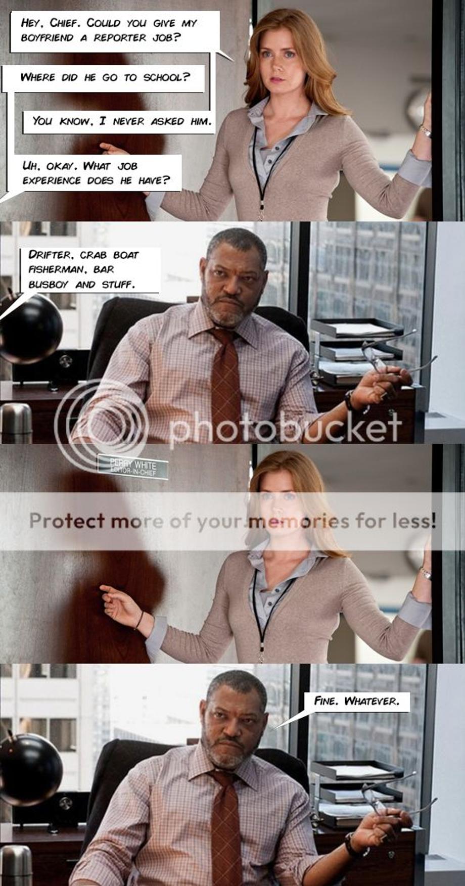 In 1978’s Superman (aka if Marvel made a Superman movie), it was fairly obvious. He crashed to Earth, grew up in Smallville, went to college to study journalism and got hired by the Daily Planet where he met the love of his life, Lois Lane, for the first time. Pretty simple, pretty sweet, right? In the new universe, I'm not given much to go on. It goes from destruction of Metropolis to 18 months later and bam! Job! I'm going to take a stab that it went something like this...