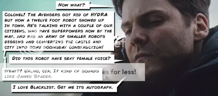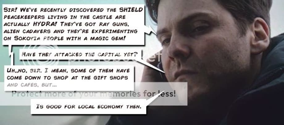 The problem I had with Zemo was the huge ineptitude he displayed as a commanding intelligence officer of a Sorkovia kill squad. The job of a country’s intelligence agency is to know what the hell is going on at all times. While it’s true that Sorkovia was in the middle of political unrest, Intelligence officers are not the ones in the street busting protesters' chops. They’re usually in the smoky room in the back, being intelligent and stuff. So how HYDRA managed to set up a secret lab, under the guise of being SHIELD, in a prominent castle right next door to the Sorkovia capital without Zemo even noticing is a little tough to believe. Maybe he knew and didn’t care…