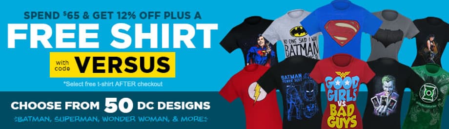 To properly utilize this brand new coupon code, find yourself 65 bucks worth of stuff that you like (which is pretty easy). From there, enter code 'VERSUS' which will take 12% off of your order and give you the option to pick from a free DC shirt! That's our way of getting people excited to see Batman V Superman: Dawn of Justice...or getting them excited to viciously flame each other on the varying merits of the film. Either way, we have you covered over at SuperheroStuff!