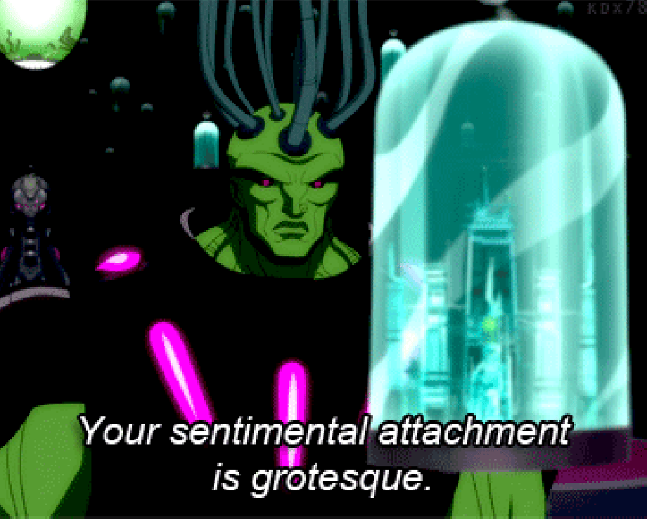 The final scene shows Brainiac walking in to a GIANT room. His mind is being stored in one of his less advanced backup bodies and he makes his way to a black throne. The rooms left wall is a giant window and we get a glimpse of a fiery planet where the skies are red and clouds are black. He kneels in front of the throne and apologizes to his "lord" for failing to harvest a city. His lord says that he doesn't mind that earth's greatest landmarks won't be salvaged. He says to Brainiac that Brainiac is the one who will be upset to see Metropolis, Themyscira, Atlantis, Olympus, and the Rock of Eternity go. He dismisses Brainiac who says "Apokolips forever" before turning away and leaving his lord. We then see his lord stand up and walk over to the window as a fleet of Parademons fly by. A frail man referred to as Desaad enters the room and asks about the fate of Brainiac. The lord says not to worry about him and that he'll no longer be in need of use. The lord tells Desaad to gather "the elite". Desaad bows and says, "Yes, lord Darkseid." He walks out of the room as we see our first look at DARKSEID!!!!!
