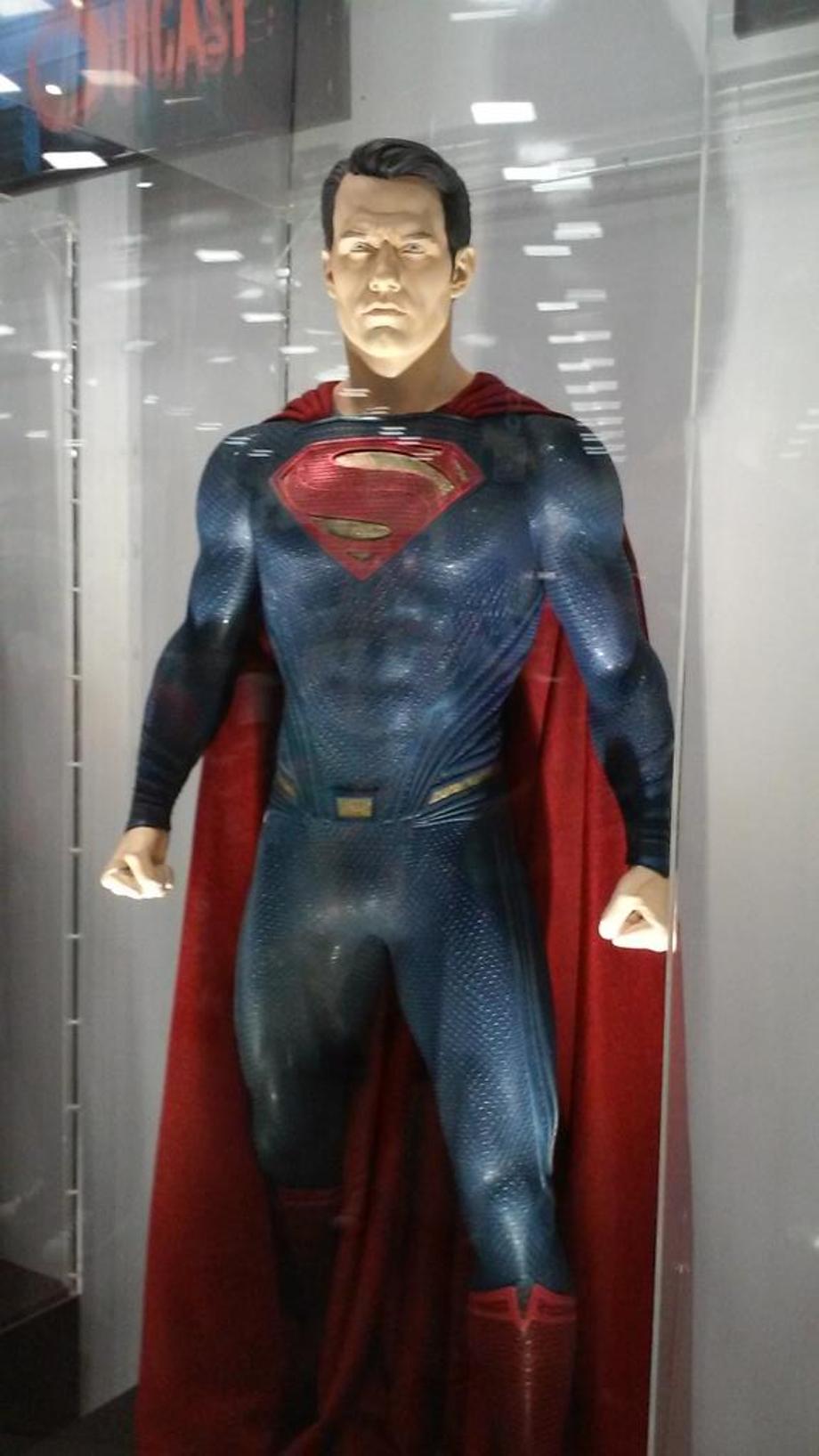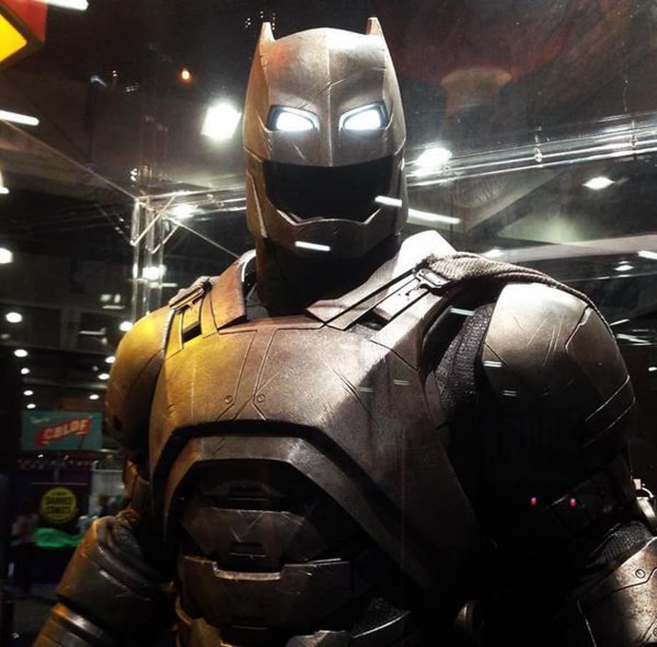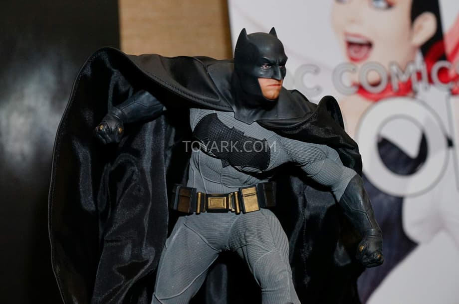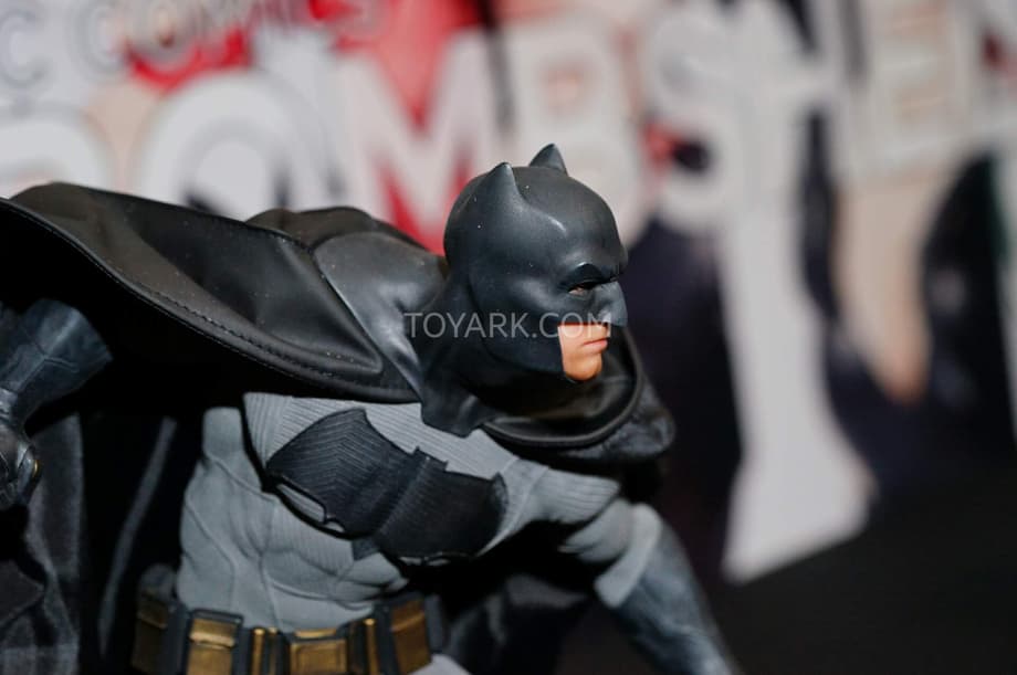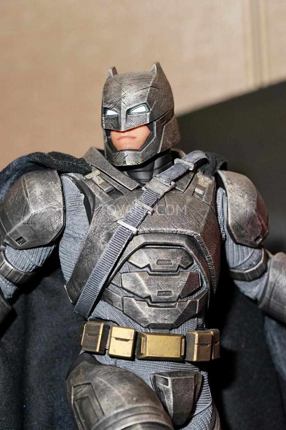 The doors have finally opened at San Diego Comic-Con, and great new photos have surfaced from the convention floor where Batman v Superman: Dawn of Justice has been heavily showcased. In addition to a closer look at the armored and traditional Batsuits, images also reveal Mattel's prop replicas of gadgets from Batman's utility belt. There's also a closer new look DC Collectibles' statues based on both the Caped Crusader and Man of Steel as they'll appear in Dawn of Justice.