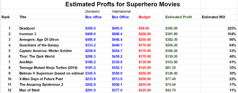 That’s only a fair-t0-middling return when lined up against comparable films. I've created a spread sheet bellow (of all the recent superheromovies that have been released) which ranks each film based on how much profit they made for their studio. Assuming my estimates for Batman v Superman are right, then on an ROI basis the film appears to be only a modest success for Warner Bros.