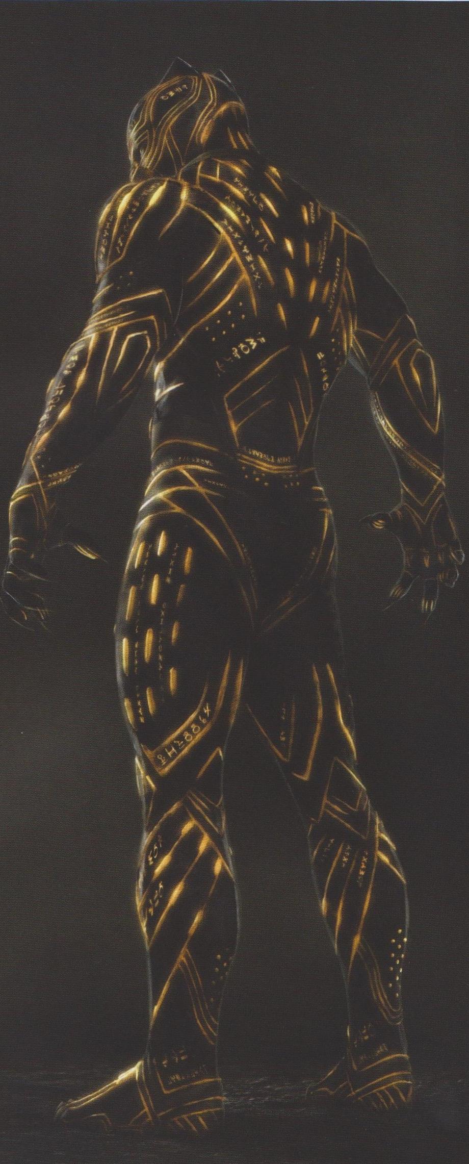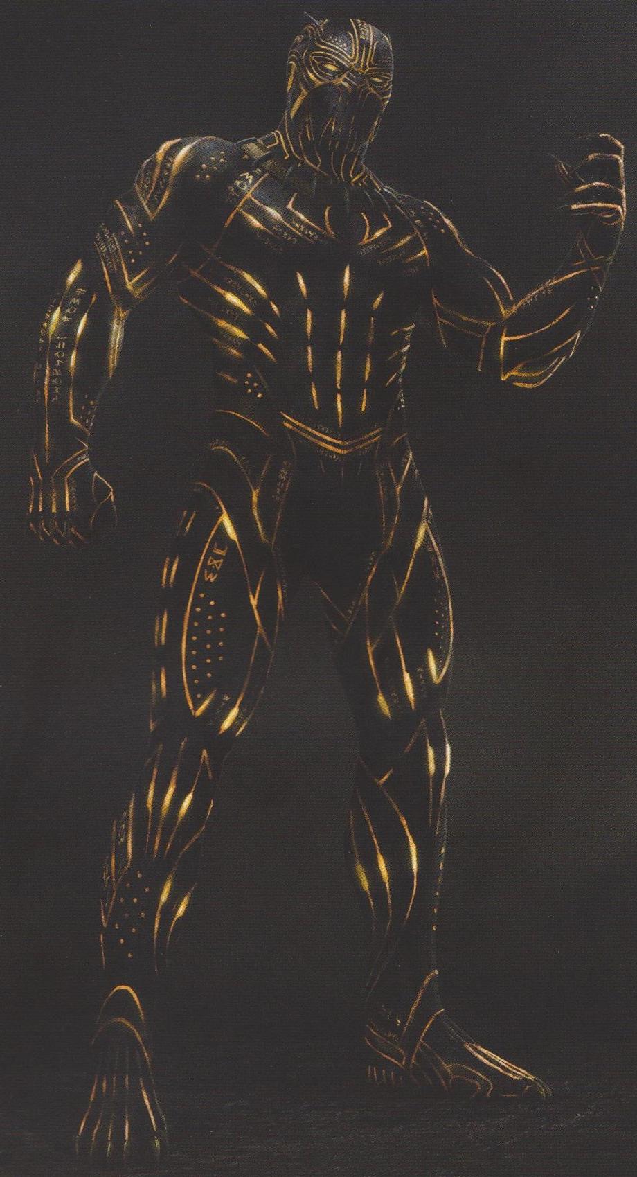 As we've already noted, the gold was a perfect choice for Killmonger's suit in Black Panther and these pieces of artwork show us just how much work went into imagining how the lines on his suit would be lit up with kinetic energy (a headache for Marvel's team of VFX artists, that's for sure).