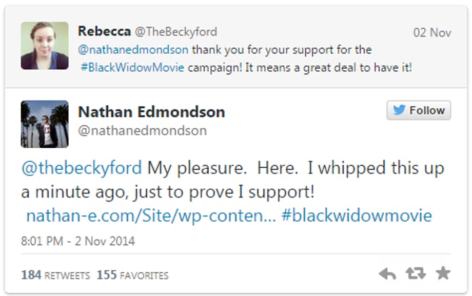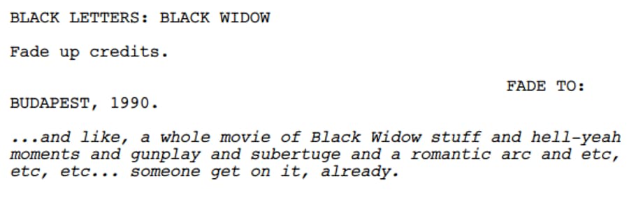 Nathan Edmondson, the current writer of Black Widow's ongoing comic series, has expressed support for a Twitter campaign that pushes for a solo movie for Scarlett Johannson's Black Widow. As part of his support for the effort, he wrote up some script pages for a Black Widow movie.