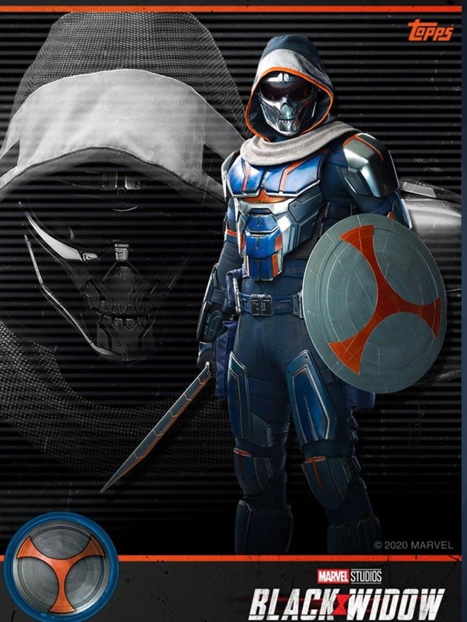 Black Widow Topps trading card image that's been shared online, we have our best look yet at a character who's sparked a lot of discussion and speculation since he first popped up in the trailers, Taskmaster.